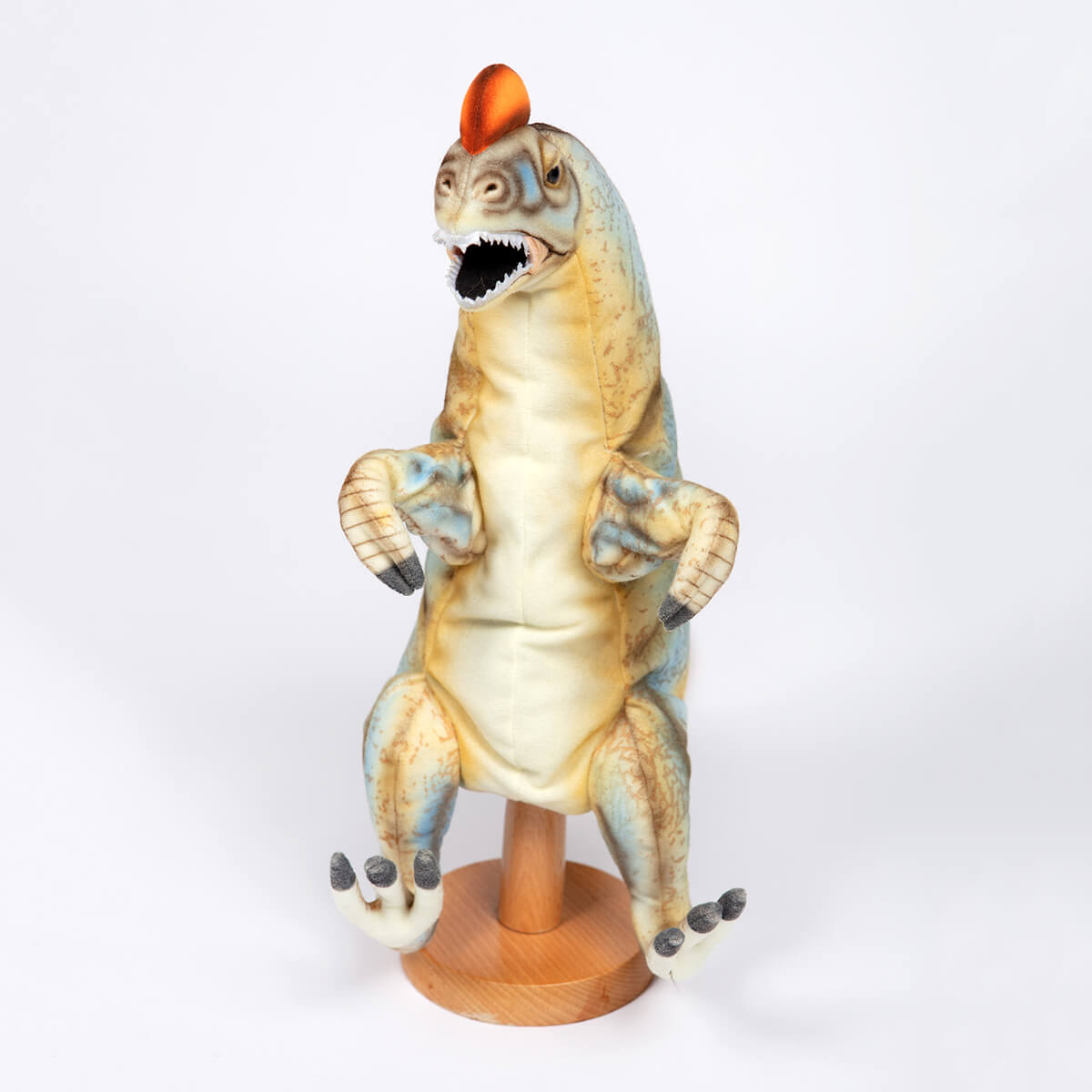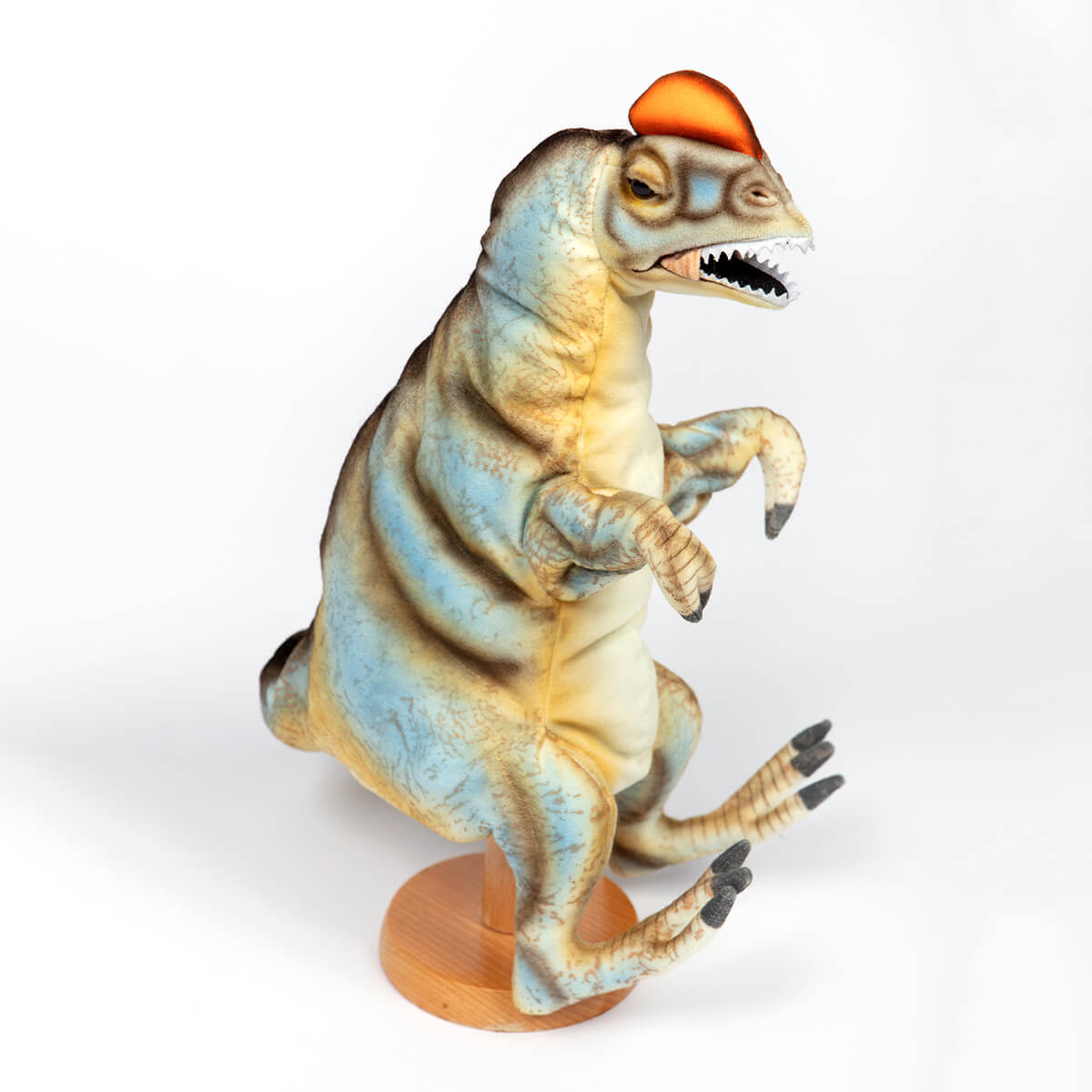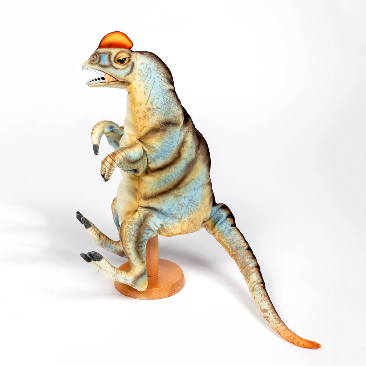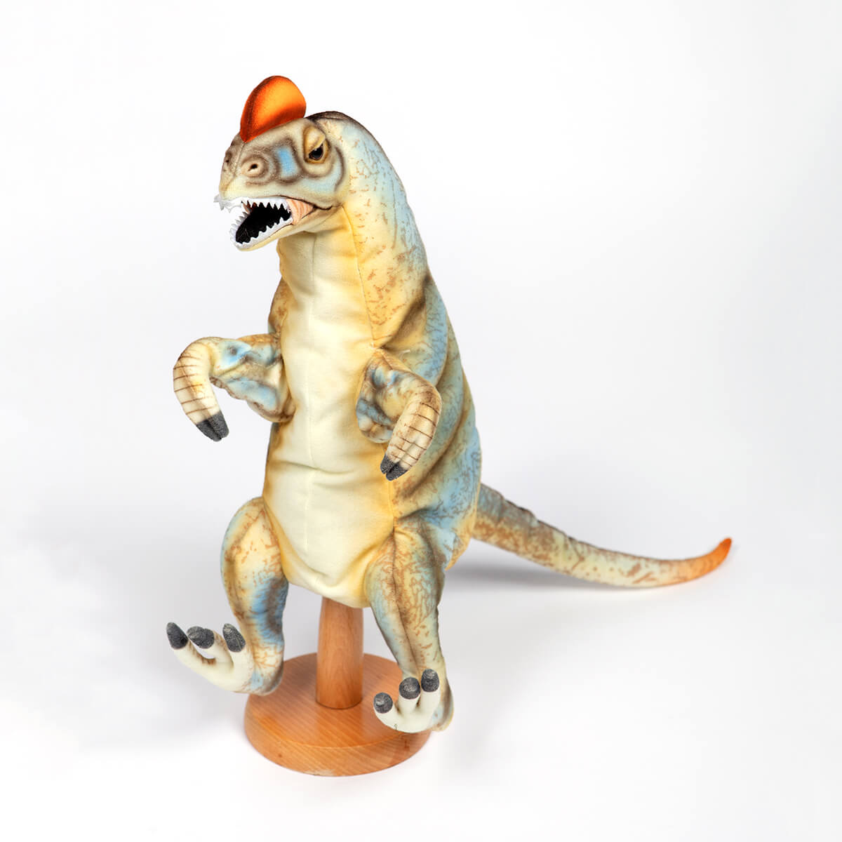 Dilophosaurus hand puppet by Hansa. Heirloom quality hand crafted plush dinosaur hand puppet.