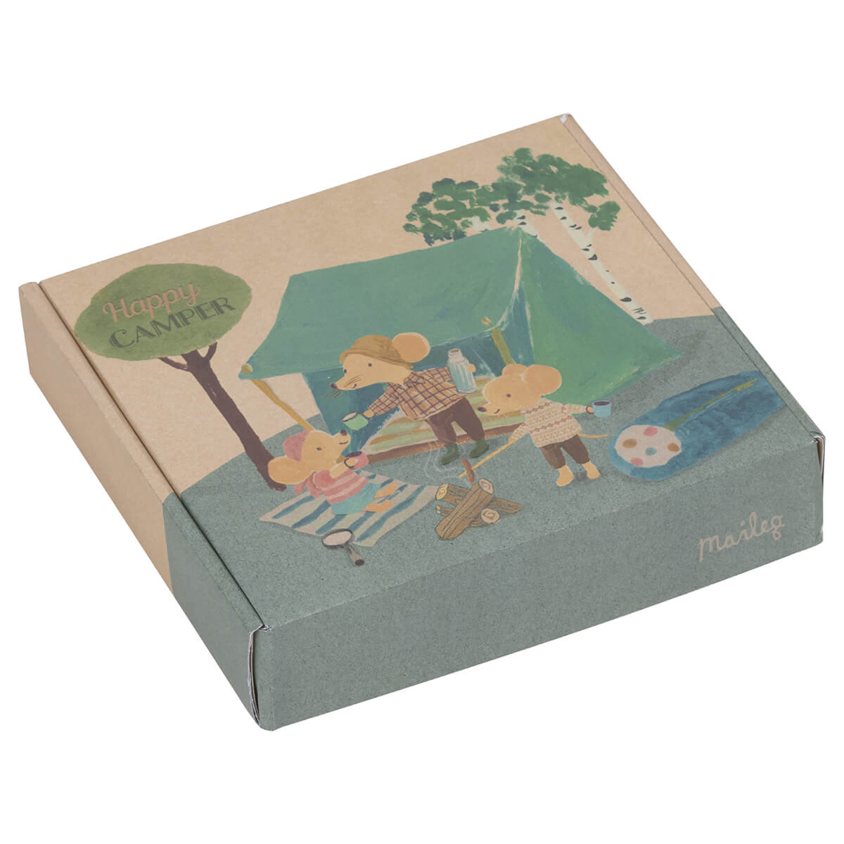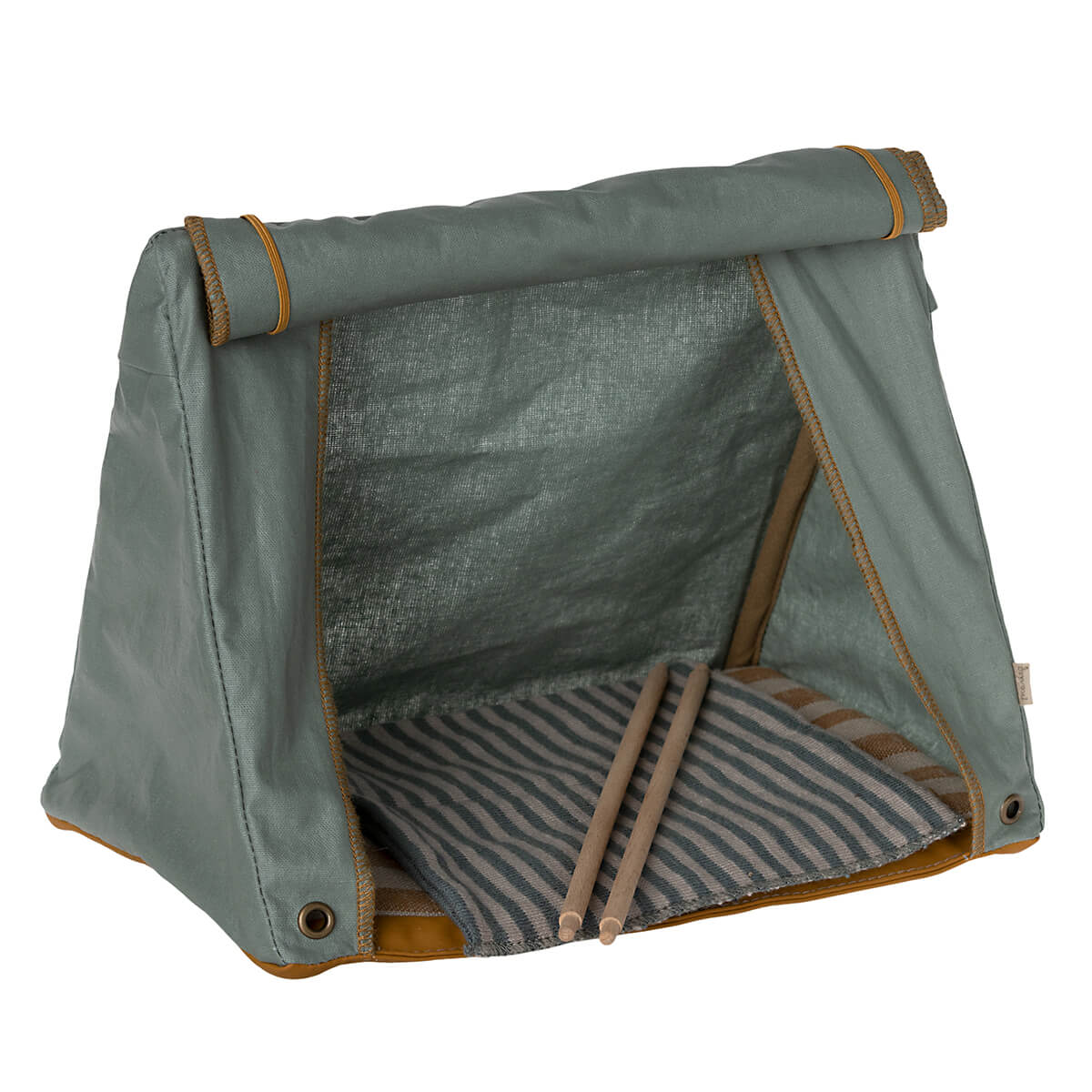 Happy Camper Tent with striped blanket by Maileg. Take your mice for a sleepover in the fold-up tent. The blanket keeps your friends warm, and the wooden sticks can hold the tent door up and give shelter from the rain. The outer fabric has a coated surface for a more authentic look. Blanket fabric may vary.