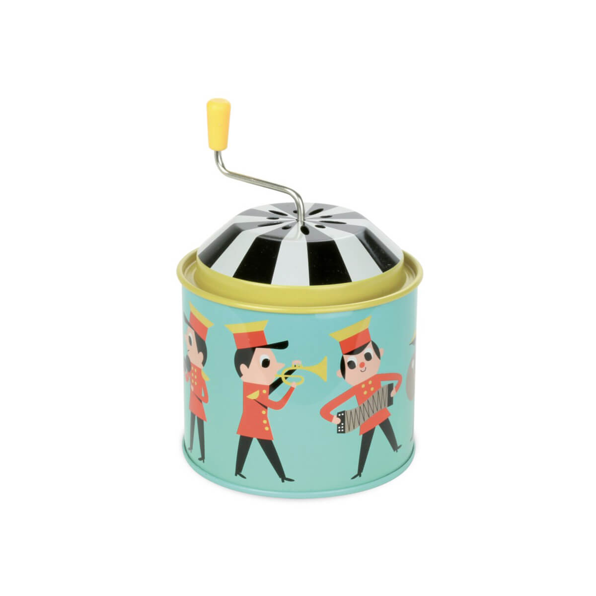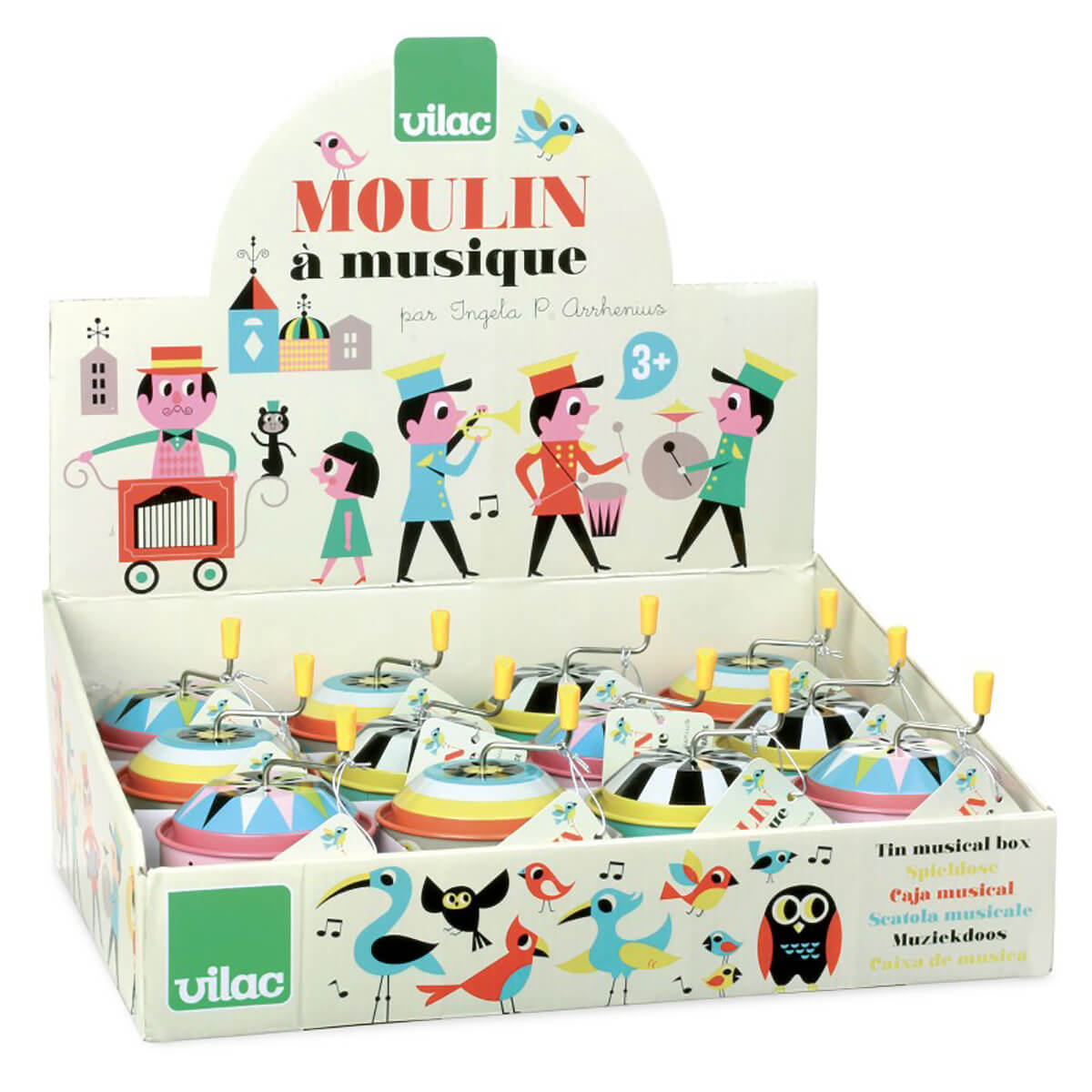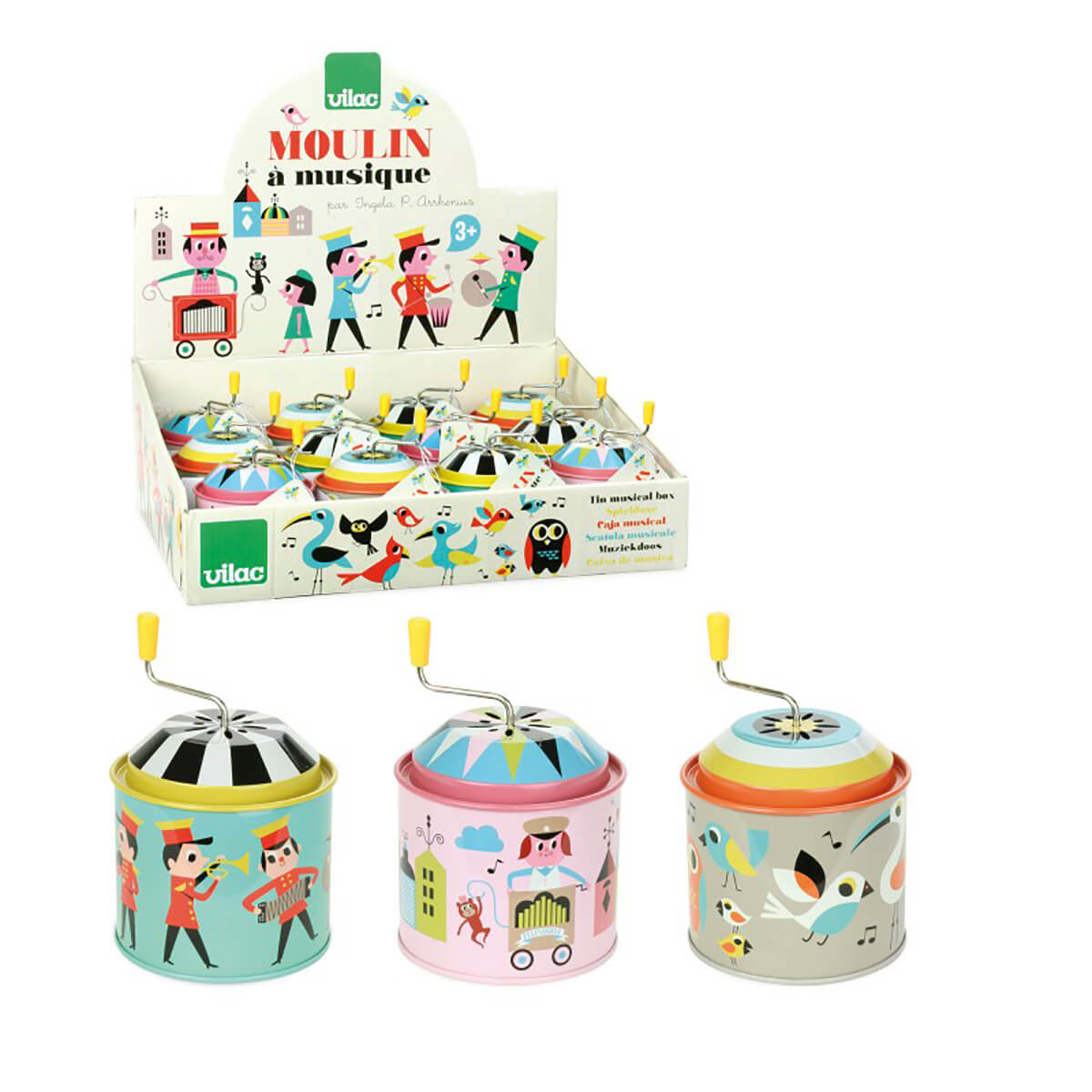 Ingela P. Arrhenius Moulins à Musique metal music box by Vilac.  Turn the handle to play the tune with this cool retro toy, available in three designs.