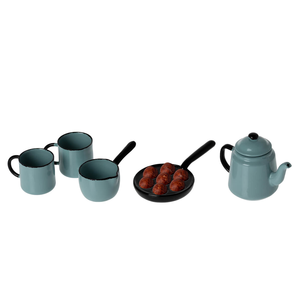 Madam Blue's Favourites by Maileg. A miniature cooking set with all Madam Blue`s favorites. A can and two cups, a saucepan and a pan with delicious puff cakes which is a traditional scandinavian treat in the winter time. All these parts come in a paper box that looks like a stove.