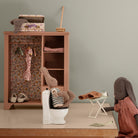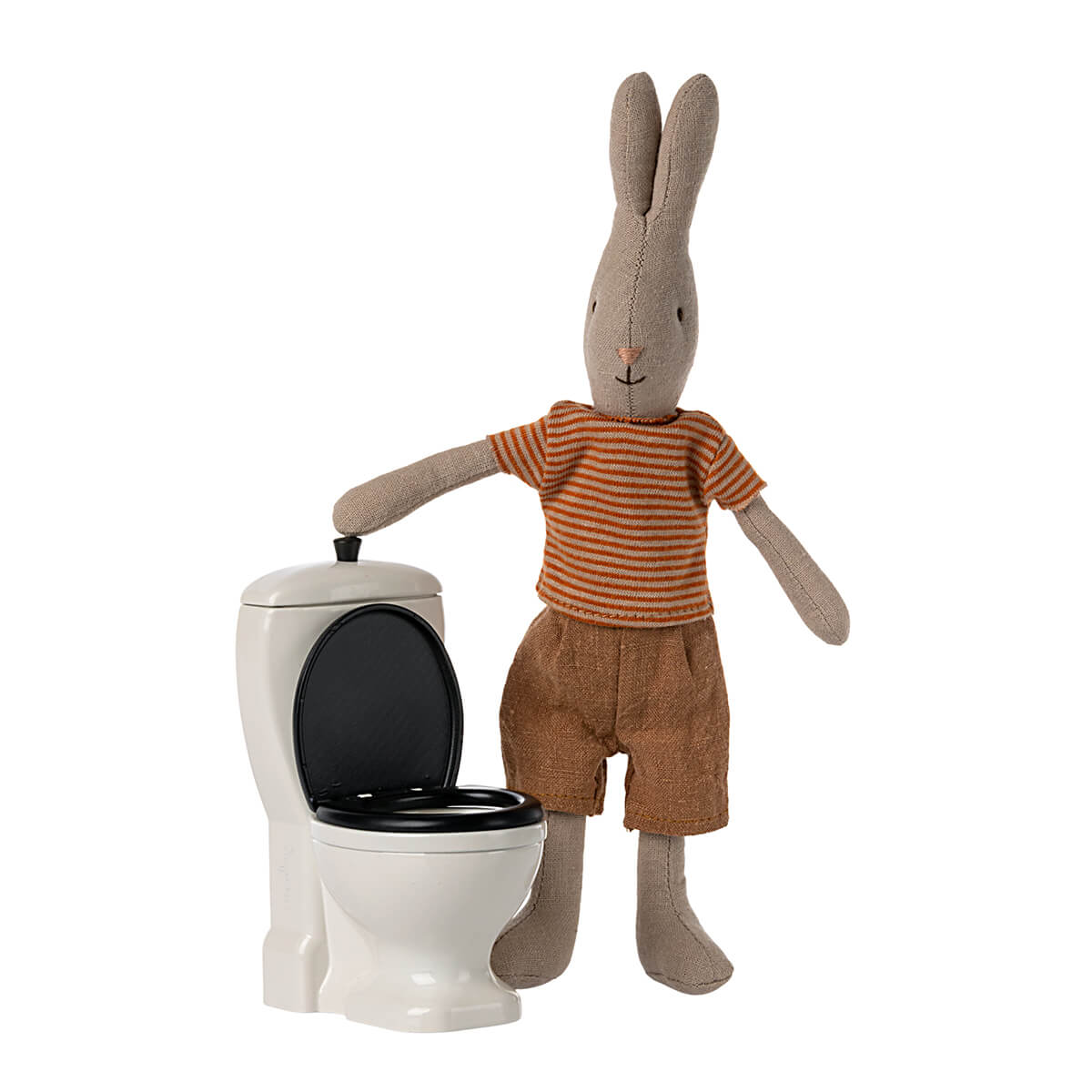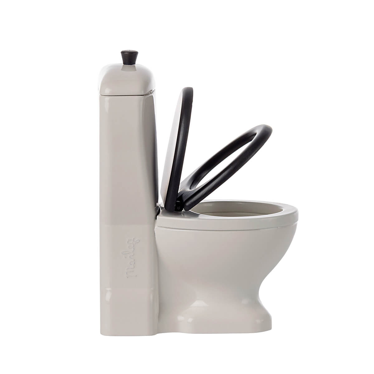 Miniature Toilet by Maileg. A toilet is added to the bathroom assortment. It is beautifully made in an off-white colour with a black seat. Seat can open and close, and a pull function in the handle makes it very real and playful.