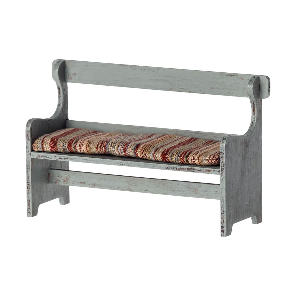 Mouse wooden bench by Maileg. A wooden bench made to fit the mouse family perfectly. It has a beautiful hand painted vintage look - variations may occur - and a soft cushion on top of the bench for a comfortable seat.
