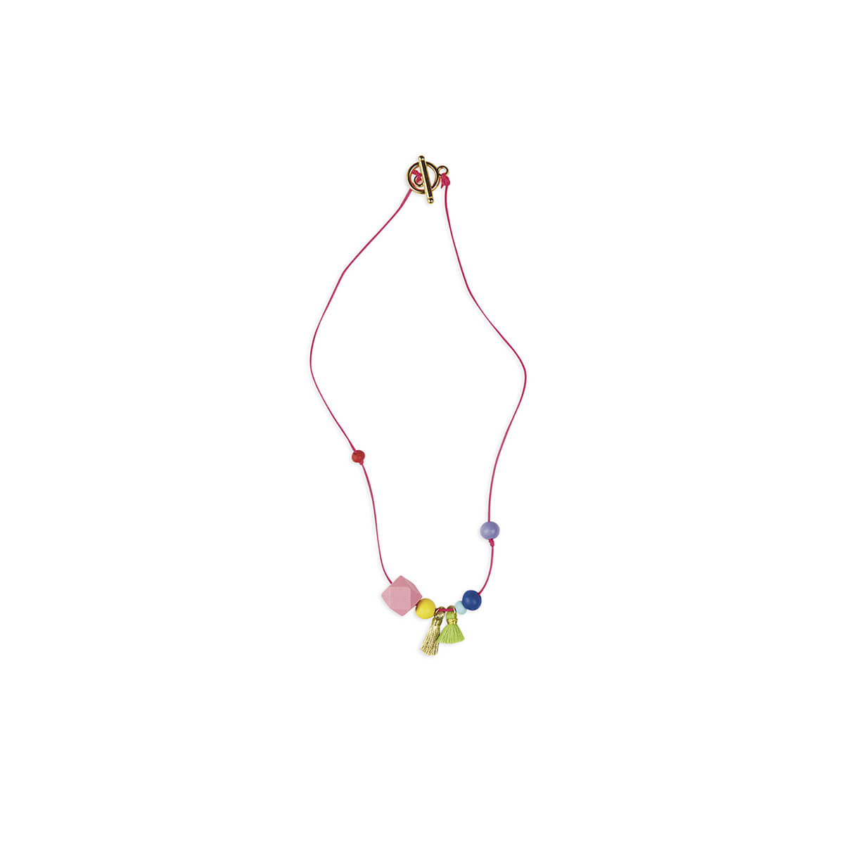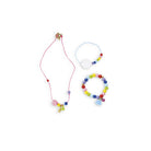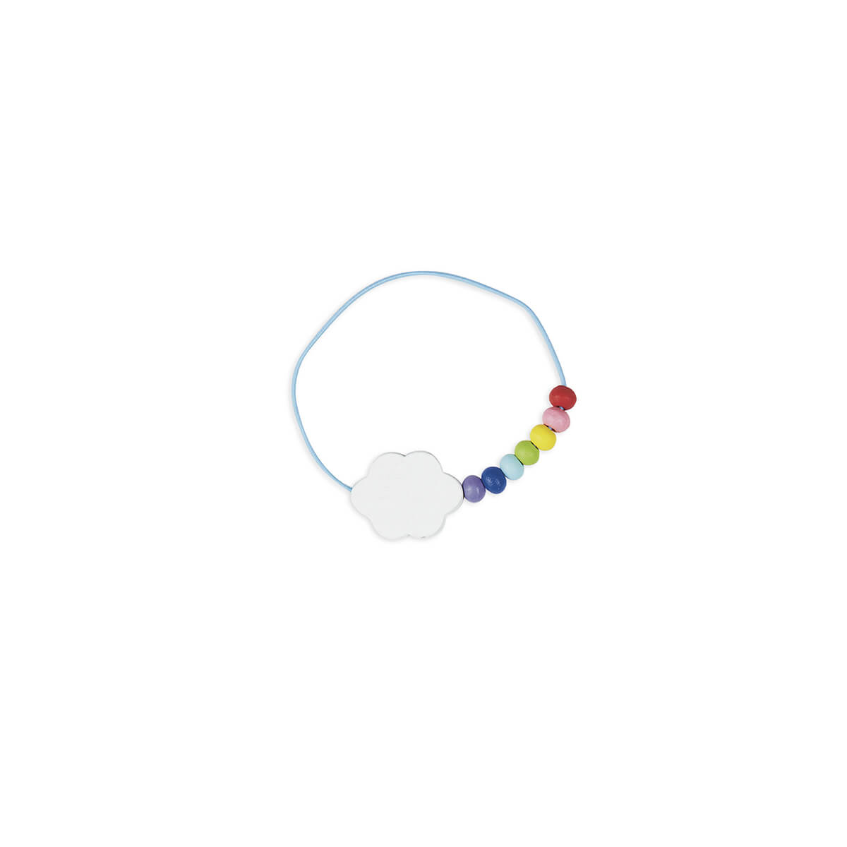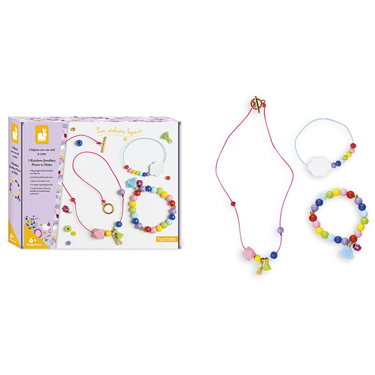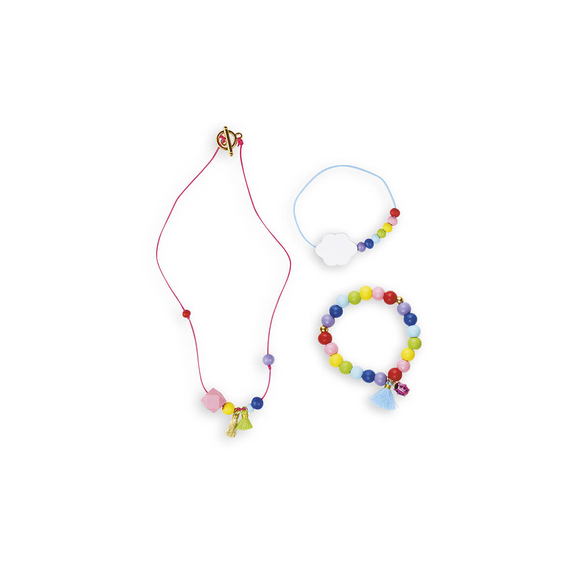 Rainbow jewellery to make by Janod. Create your own jewellery set with rainbow-coloured wooden beads. This creative kit allows you to make 2 bracelets and 1 necklace out of wooden beads in bright colours. A detailed photo booklet will help children complete each step. A small ladybird charm, a good luck symbol and pompoms will add a touch of fantasy to these three stylish pieces of jewellery.