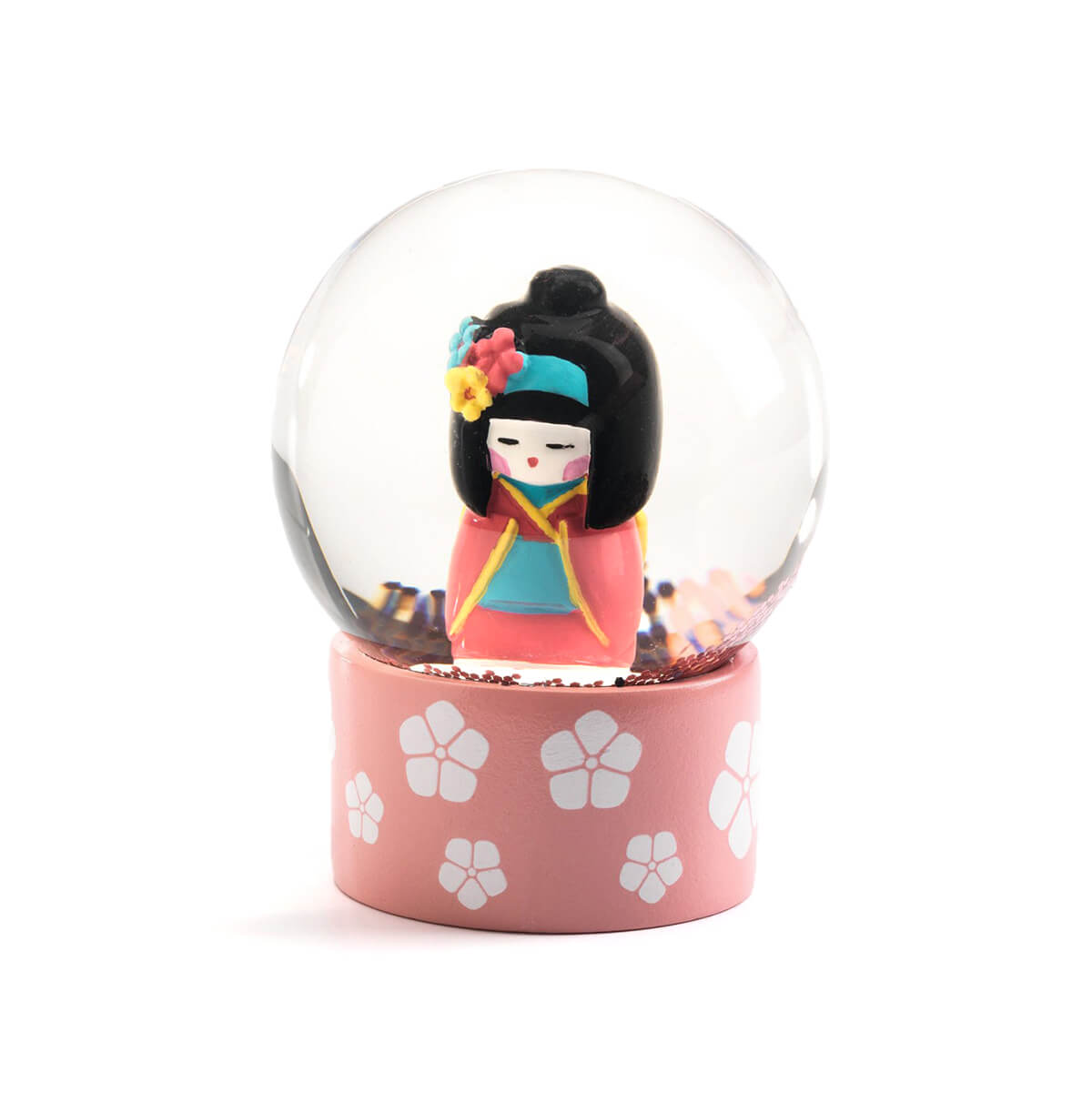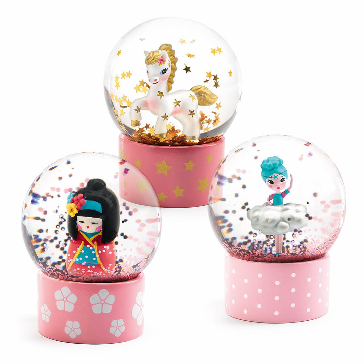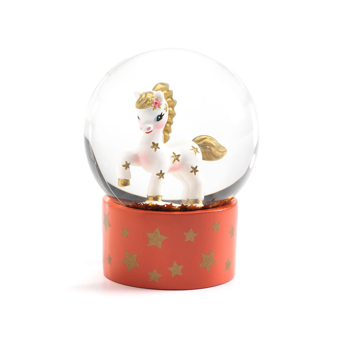 So Cute mini snow globe by Djeco. A sweet little mini snow globe with glittery snowflakes in three different designs - pony, kokeshi doll and ballerina. Sturdy shatter-resistant design suitable for children aged three and up.
