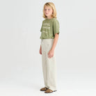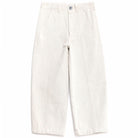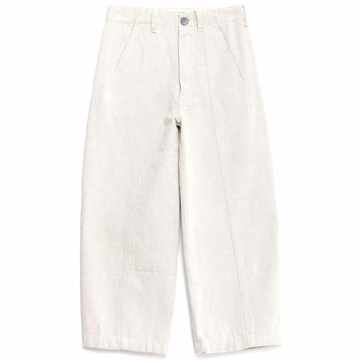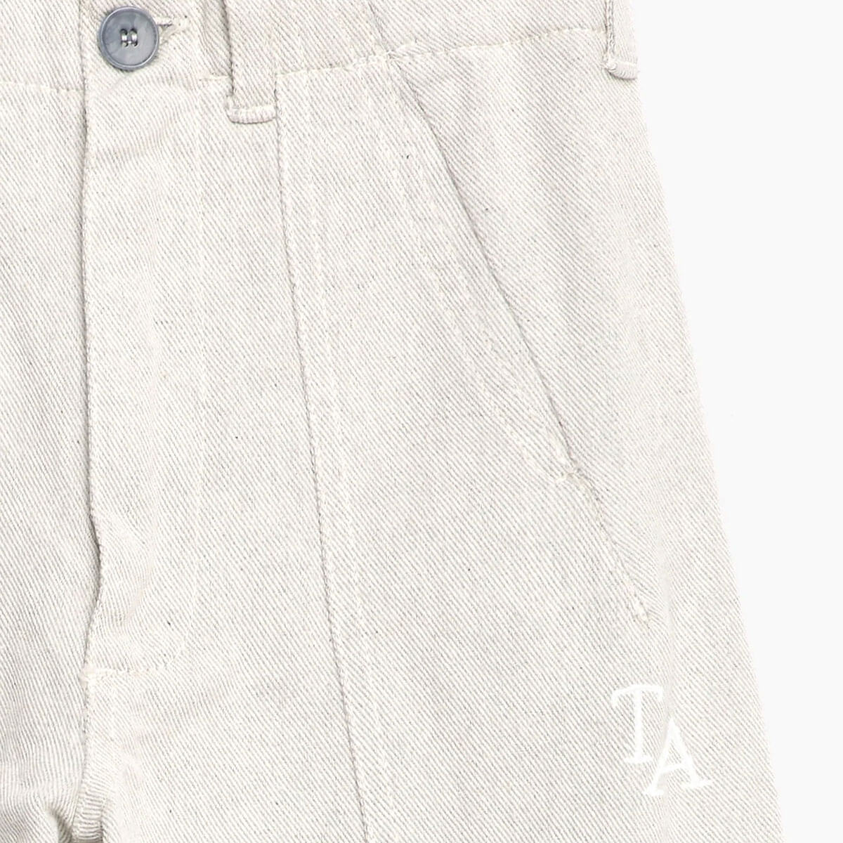 Trousers nº14 by True Artist. Trousers nº14 in Glacier Grey are made of 56% recycled cotton and 44% cotton. These highly detailed pants feature the TA logo embroidered on the front and they are designed with front slash pockets and back patch pockets. They have front zip and button fastening and have a straight fit.