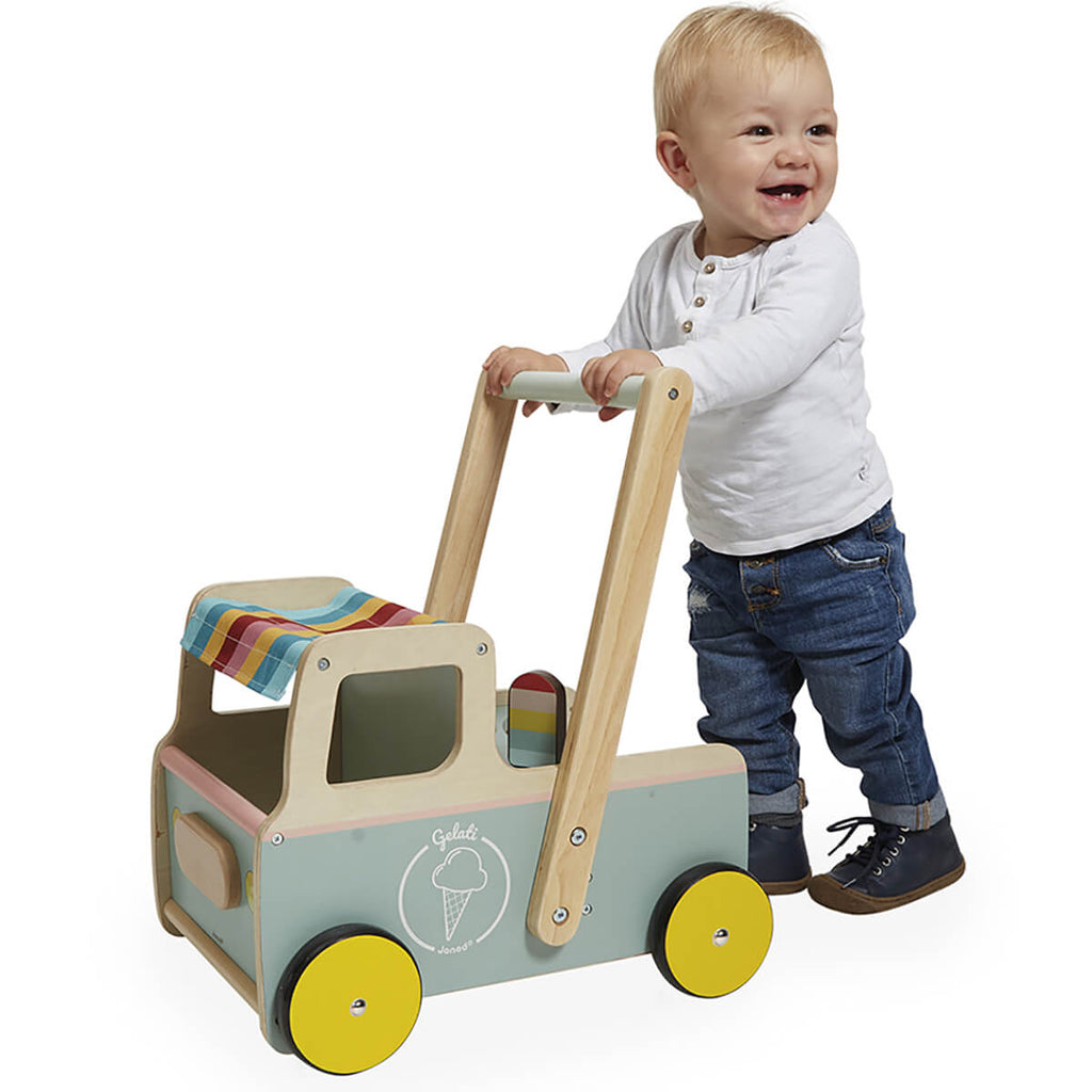 Ice Cream Cart Push Along Trolley by Janod. Would you prefer sorbet or ice cream? The ice cream seller is coming to town with this stylish trolley that will look great in any room. This push along cart helps baby with learning to walk while serving up 4 delicious wooden ice creams.