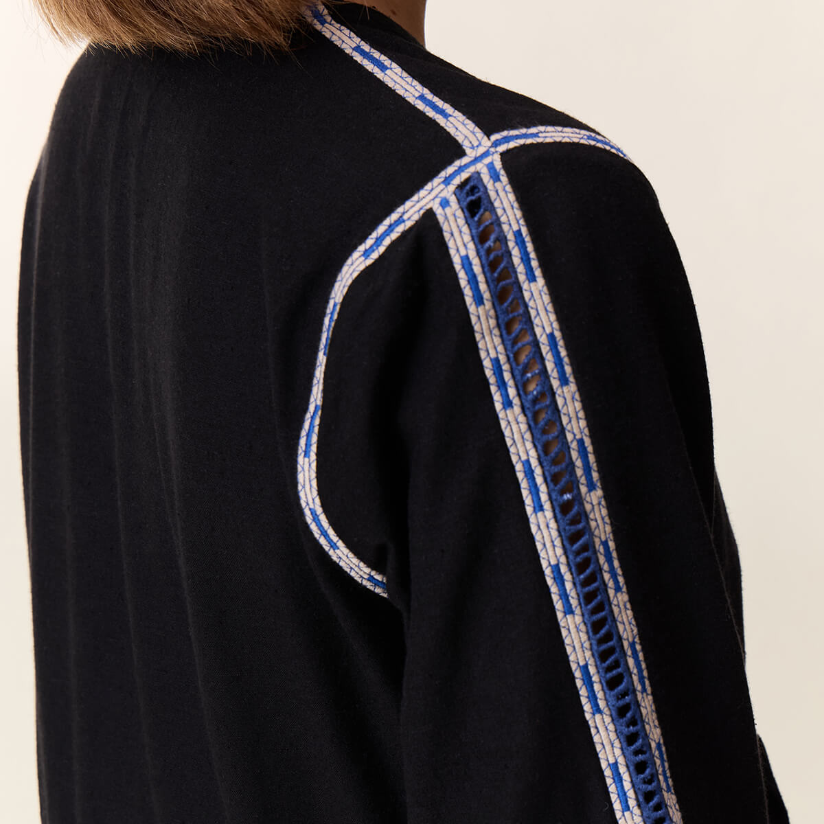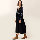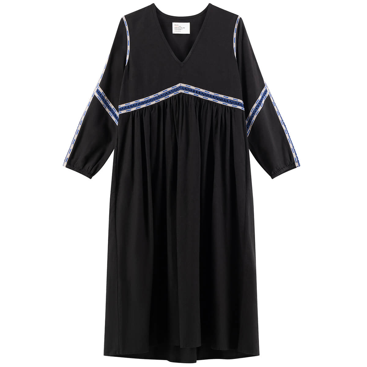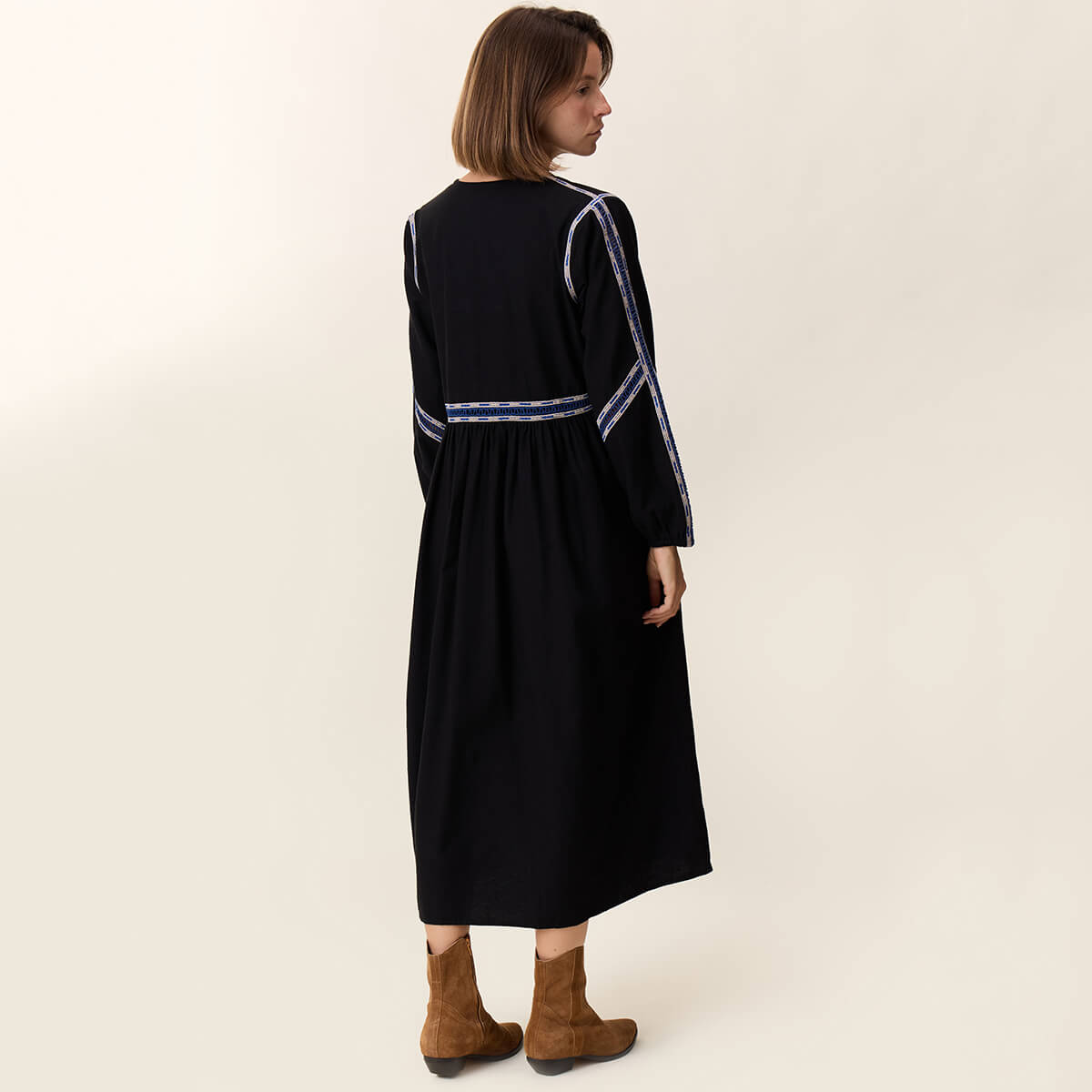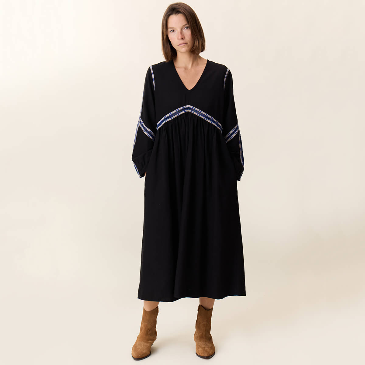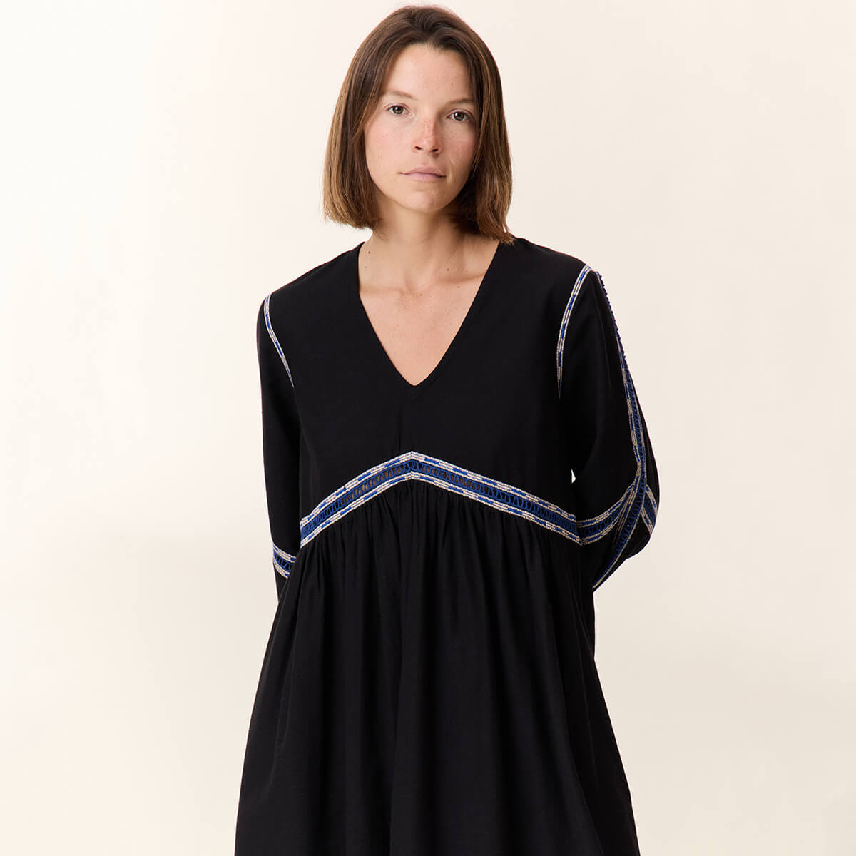 Reeta Dress by Leon & Harper. The Reeta dress expresses the signature spirit of Leon & Harper, energized by a midi cut and a V-neckline. The long sleeves are highlighted with embroidered bands featuring geometric patterns, continuing onto the bodice for a distinctive graphic effect. The gathered waist ensures a fluid drape and subtly shapes the silhouette.