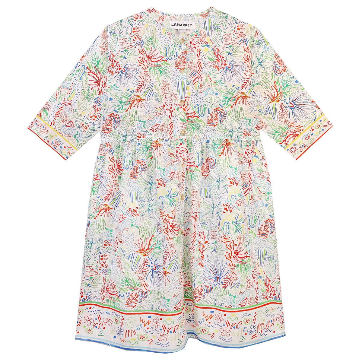 Samuel Dress by L.F.Markey. This relaxed fit smock dress falls just above the knee, with a round neckline, button through front and gathered waist to add volume. In our limited edition Crayon Floral print, featuring an illustrated border on the sleeve and skirt hem. Finished with two signature oversized front patch pockets and two side pockets.