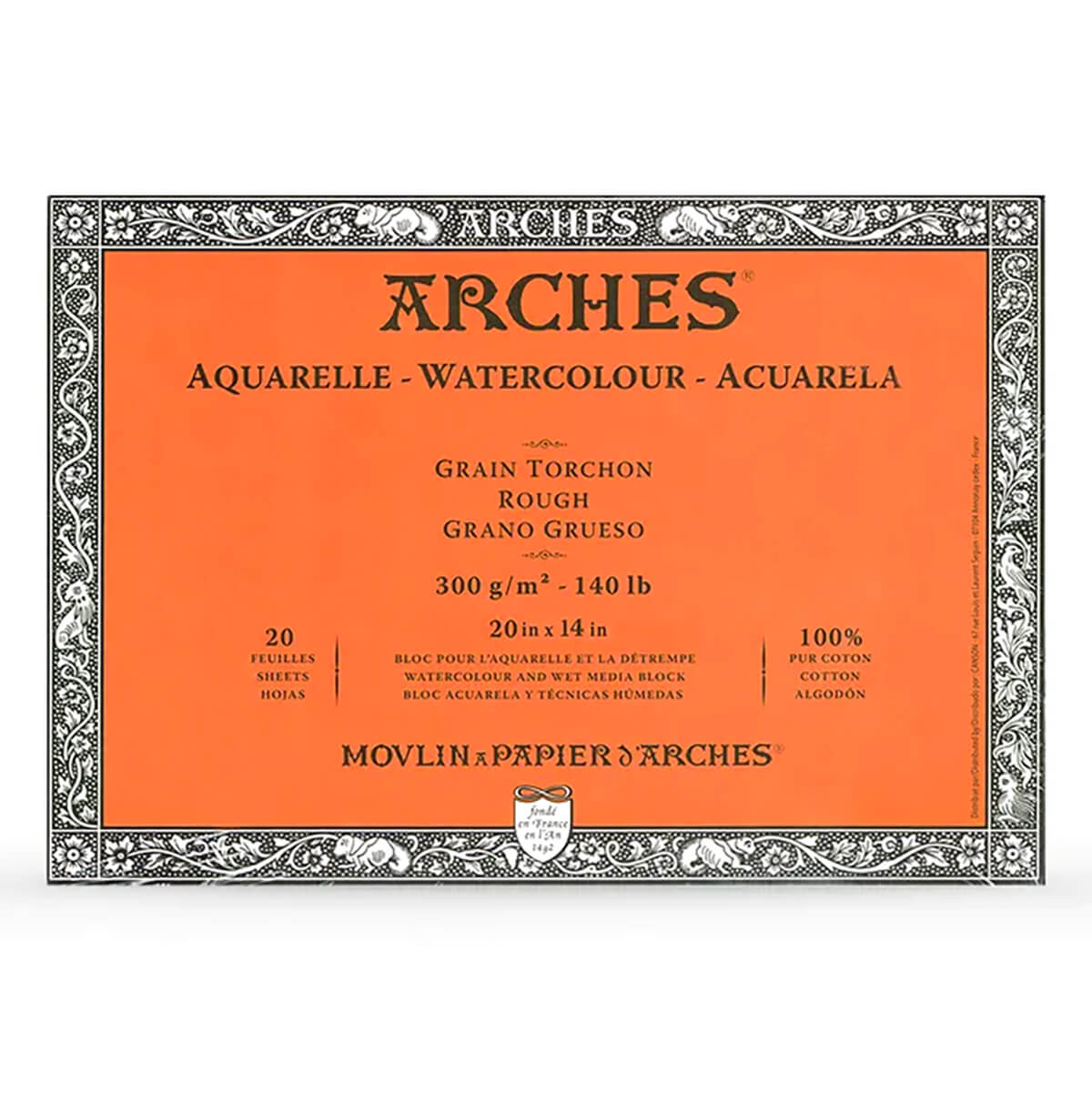 Arches Rough Watercolour Block by RK Burt. Rough watercolour paper is a highly textured painting surface ideal for landscapes or sea scenes. The block is sealed on all sides which means it can be painted on straight away without need for pre-stretching, and can be removed from the block using a palette knife.