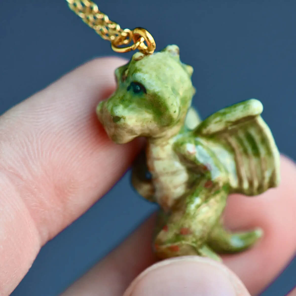 Baby Dragon ceramic pendant by Camp Hollow. Hand-crafted and meticulously hand-painted porcelain animal pendant on a 24 karat gold-plated stainless steel chain. Comes in its own beautiful story book shaped gift box. Every Camp Hollow wearable is designed as a limited edition, ensuring that your special pendant animal will become a cherished heirloom for generations to come.