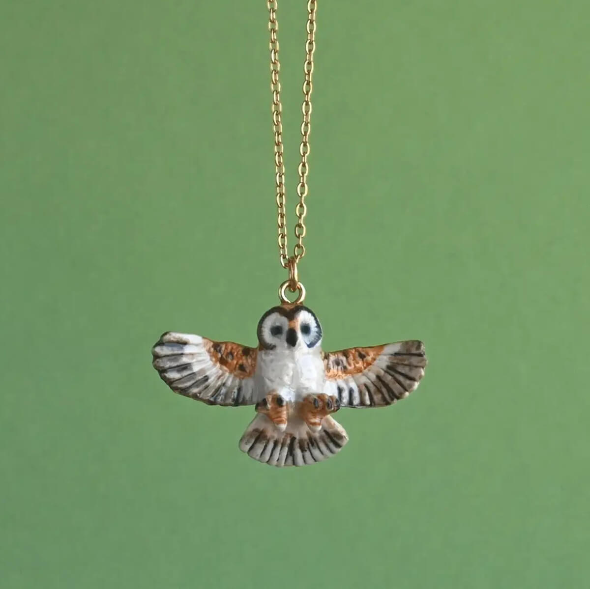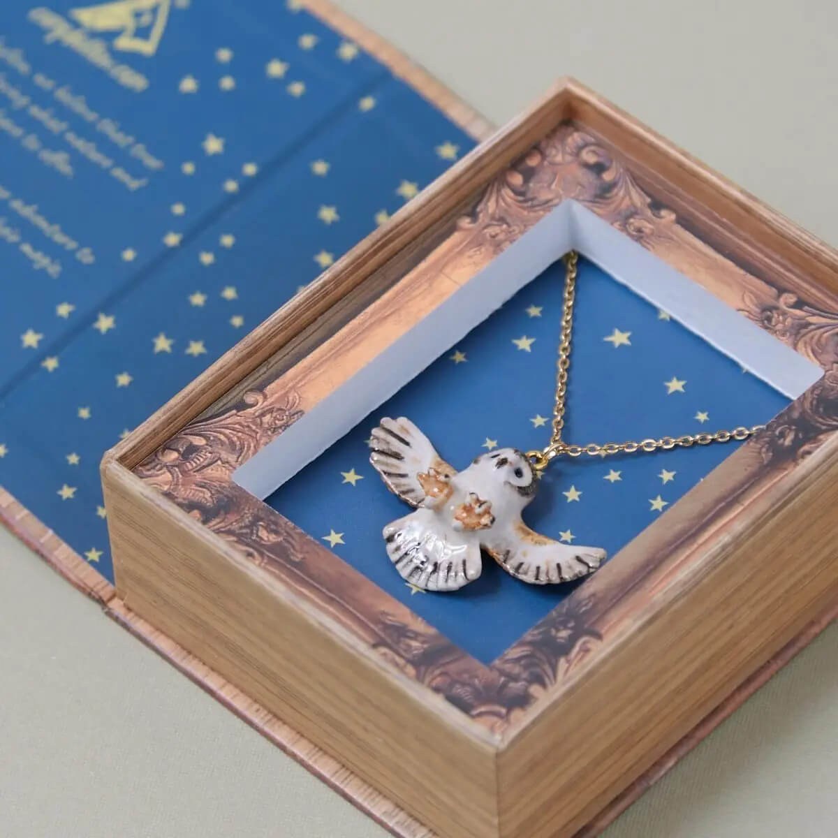 Barn Owl ceramic pendant by Camp Hollow. Hand-crafted and meticulously hand-painted porcelain animal pendant on a 24 karat gold-plated stainless steel chain. Comes in its own beautiful story book shaped gift box. Every Camp Hollow wearable is designed as a limited edition, ensuring that your special pendant animal will become a cherished heirloom for generations to come.