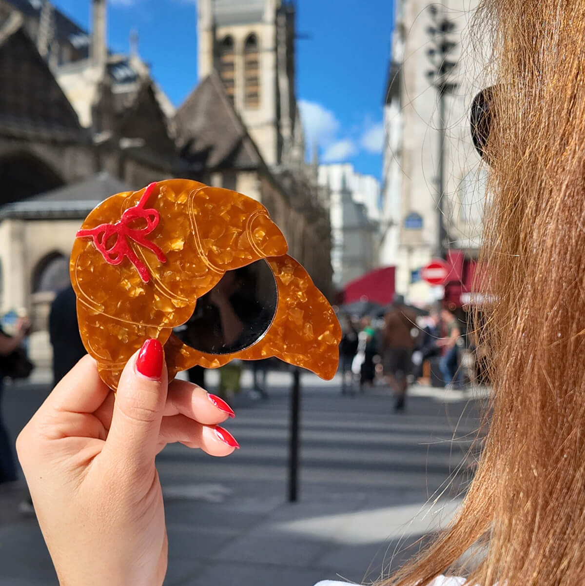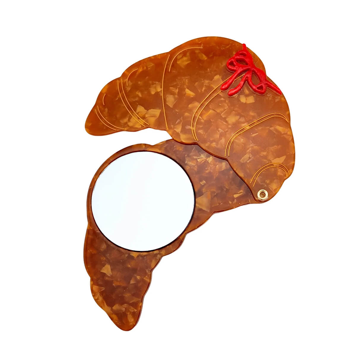 Bow Croissant Compact Mirror by Solar Eclipse. The Compact Mirror is a contemporary handbag essential, intentionally designed in New York City to bring beauty and function to your everyday routine. Crafted in small batches, this slim mirror is your on-the-go bestie. Perfect for a quick lip check, smoothing stray hairs, or a midday moment of glam. It’s pretty enough to flash and small enough to fit in even your tiniest baguette bag. Each mirror features an original, hand-painted design created by Solar Eclipse artists. The Bow Croissant style is sculptural, playful, and full of personality. Turning an everyday object into a signature accessory.