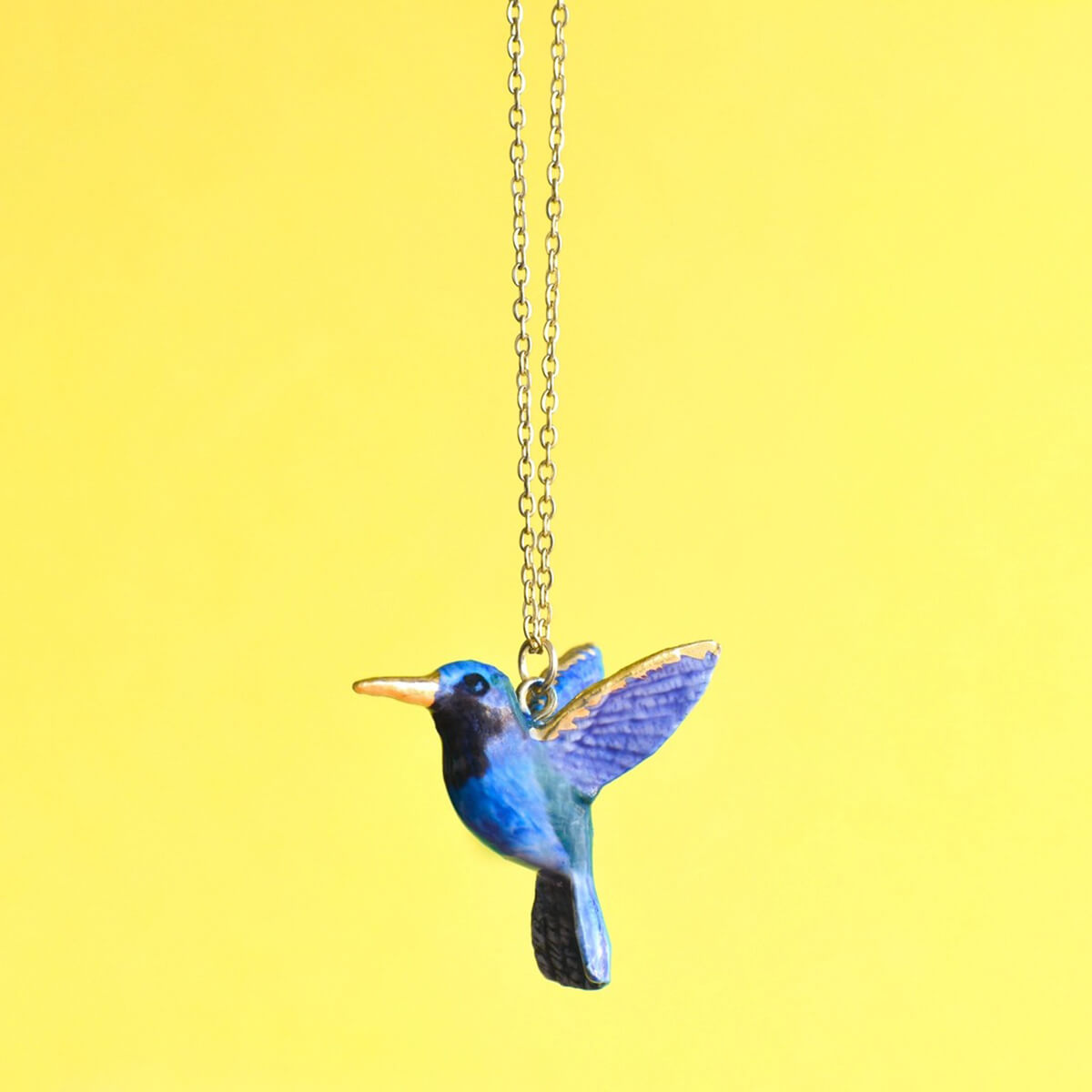 Hummingbird ceramic pendant by Camp Hollow. Hand-crafted and meticulously hand-painted porcelain animal pendant on a 24 karat gold-plated stainless steel chain. Comes in its own beautiful story book shaped gift box. Every Camp Hollow wearable is designed as a limited edition, ensuring that your special pendant animal will become a cherished heirloom for generations to come.