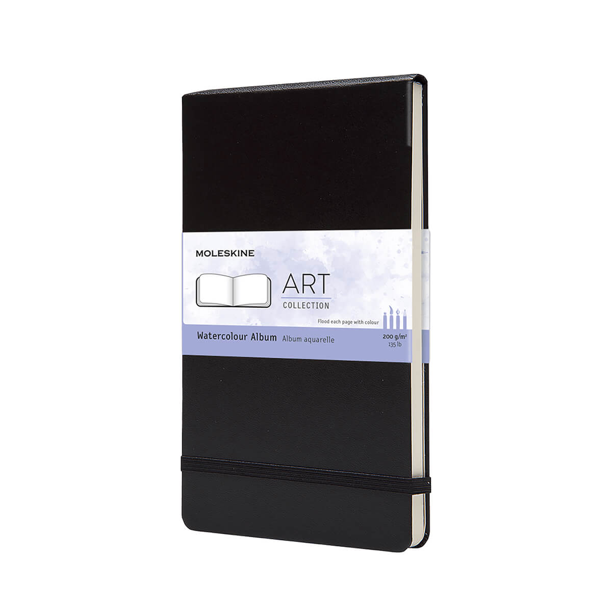 Pocket Watercolour album in black by Moleskine. From Moleskine's Art Collection, the pocket watercolour album is bound in cardboard, with a classic 'moleskine' cover with rounded corners and an elastic enclosure. Each notebook has an expandable inner note holder made of cardboard and cloth. Features a special heavy paper for watercolour painting, 200 gsm with 25% cotton fiber, cold pressed, identical on both sides, and specially created for Moleskine.