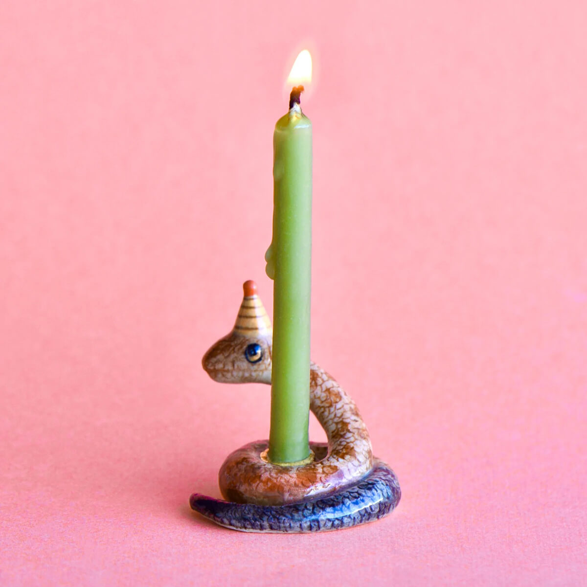 Snake ceramic cake topper by Camp Hollow. Start a celebration with this Chinese zodiac inspired collectible keepsake, featuring a gold lustre cup that holds a standard size birthday candle. Crafted in fine porcelain and meticulously hand-painted, this beautiful heirloom quality candle holder will celebrate every birthday and occasion for years to come.
