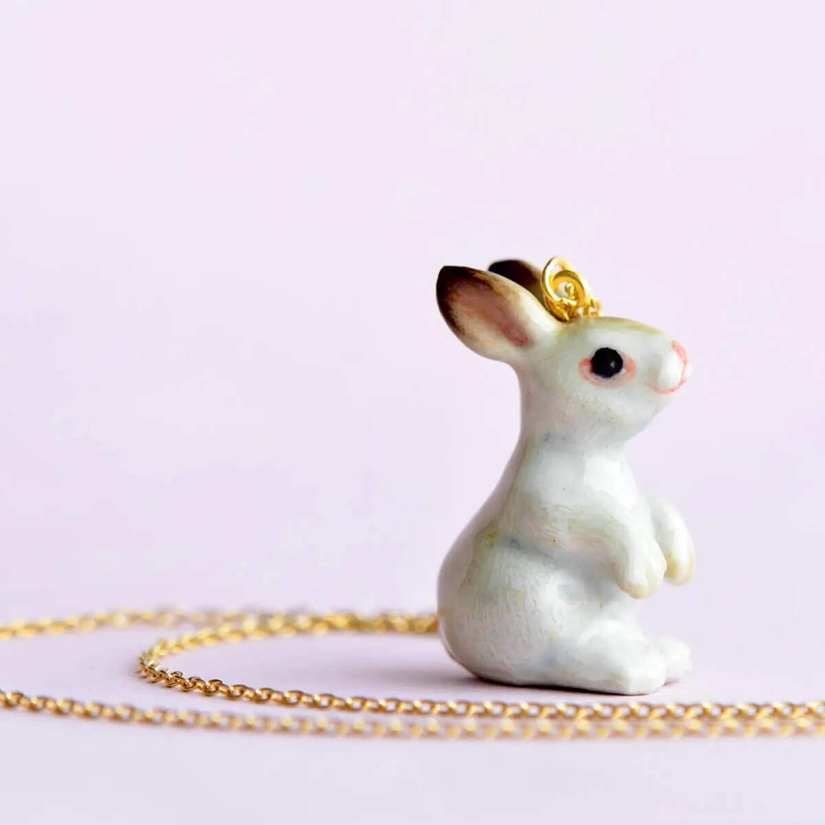 White rabbit ceramic pendant by Camp Hollow. Hand-crafted and meticulously hand-painted porcelain animal pendant on a 24 karat gold-plated stainless steel chain. Comes in its own beautiful story book shaped gift box. Every Camp Hollow wearable is designed as a limited edition, ensuring that your special pendant animal will become a cherished heirloom for generations to come.