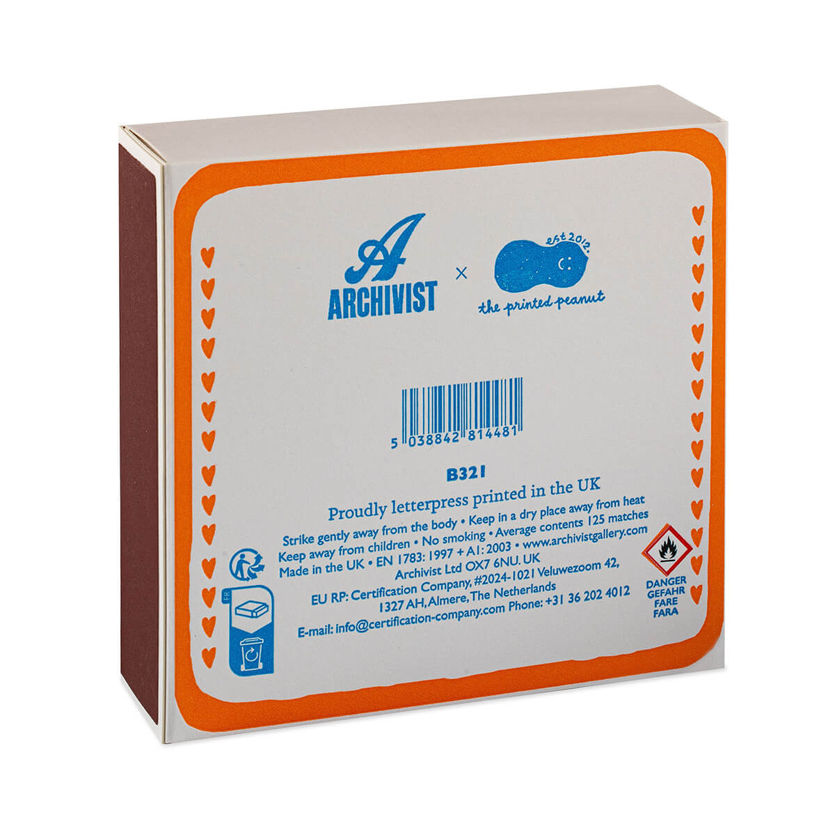 Please note: These matches are made from natural products and may contain inherent structural flaws. Whilst Archivist Gallery take time to test the matches, they cannot reasonably test every single one, so strike the match gently (easy does it!) and away from you, over non-combustible surfaces.
