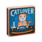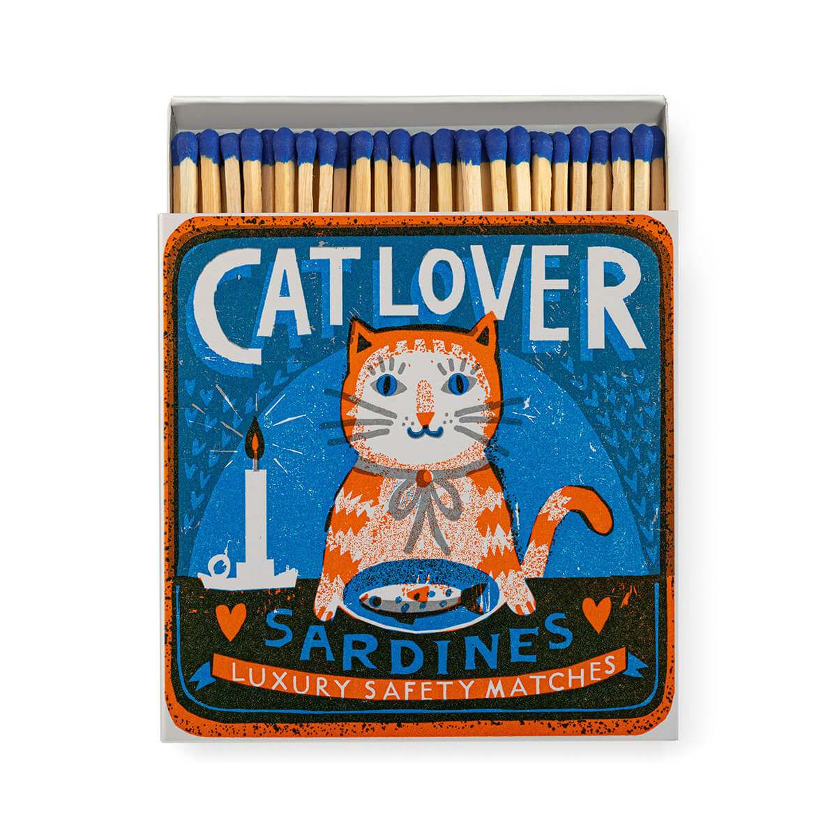 Boxed Matches by Archivist Gallery. Archivist Gallery's signature square matchbox featuring a ginger tabby cat sitting at a table with a sardine in front of him and the words 'Cat Lover, Sardines, Luxury Safety Matches.' Striking in every sense, these matchboxes are filled with 125 matchsticks ready to spark a little joy. Designed to add character to coffee tables, mantelpieces, and gift drawers, each box is a blend of function and flair.