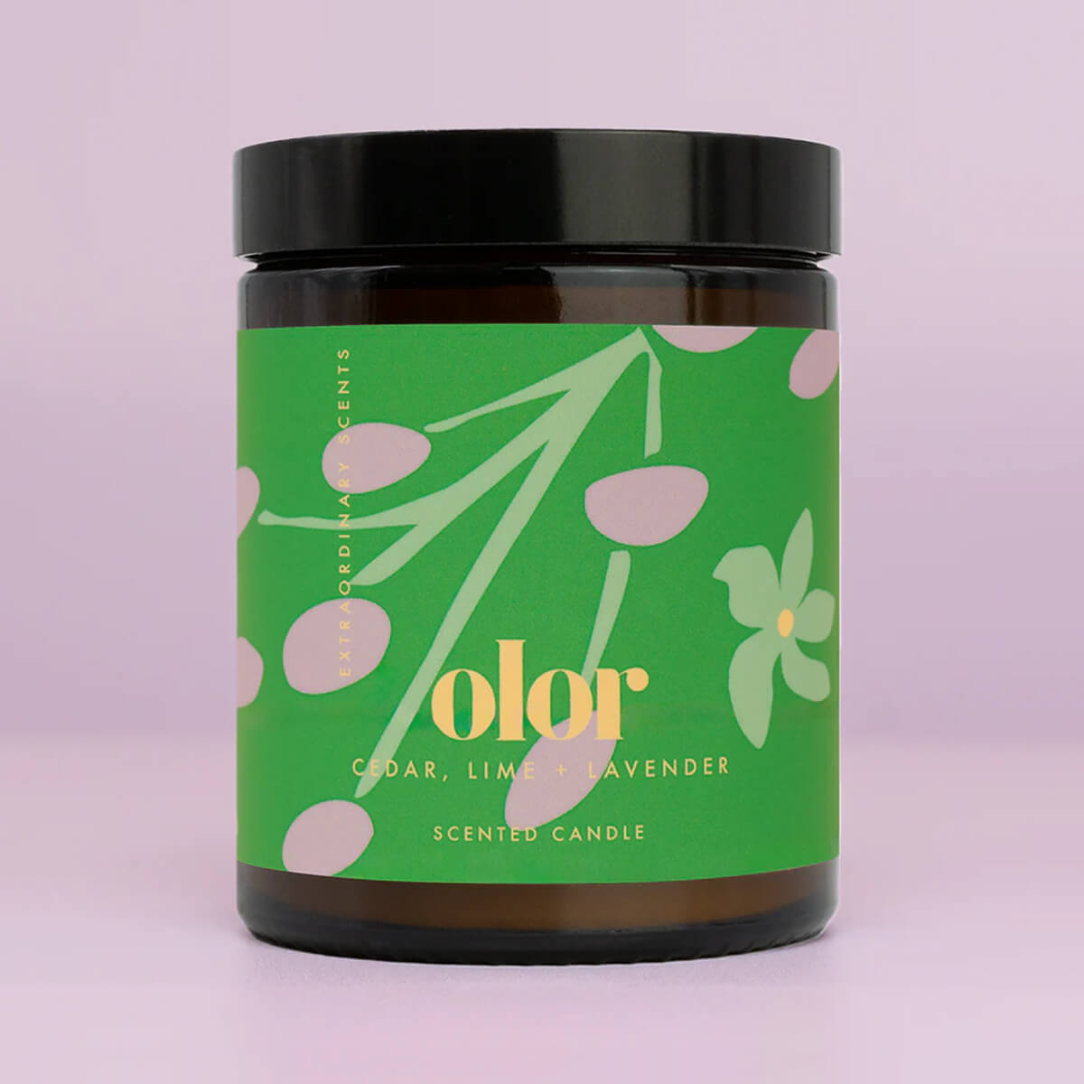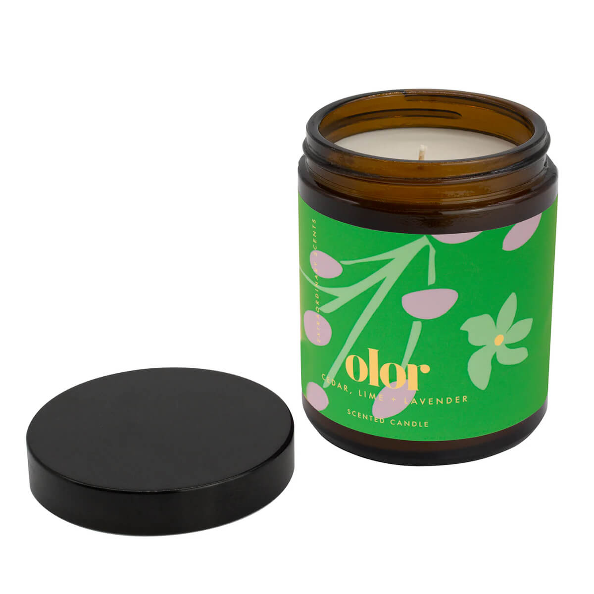 Cedar, Lime and Lavender Fragranced Jar Candle by Olor. Unwind with the crisp freshness of lime and green herbs, softened by calming lavender and spearmint, resting on a rich, masculine base of cedarwood, sandalwood, amber and tonka bean. The dark glass jar is the perfect choice for individuals seeking a high-quality luxury candle with a relaxed and artistic vibe. The jar's sleek design, combined with Olor's vibrant and imaginative branding, offers the best of both worlds - a luxury candle housed in a vessel that seamlessly blends into any environment. Enjoy the freedom to express your style and indulge in a touch of luxury with this unique and captivating scented jar candle.