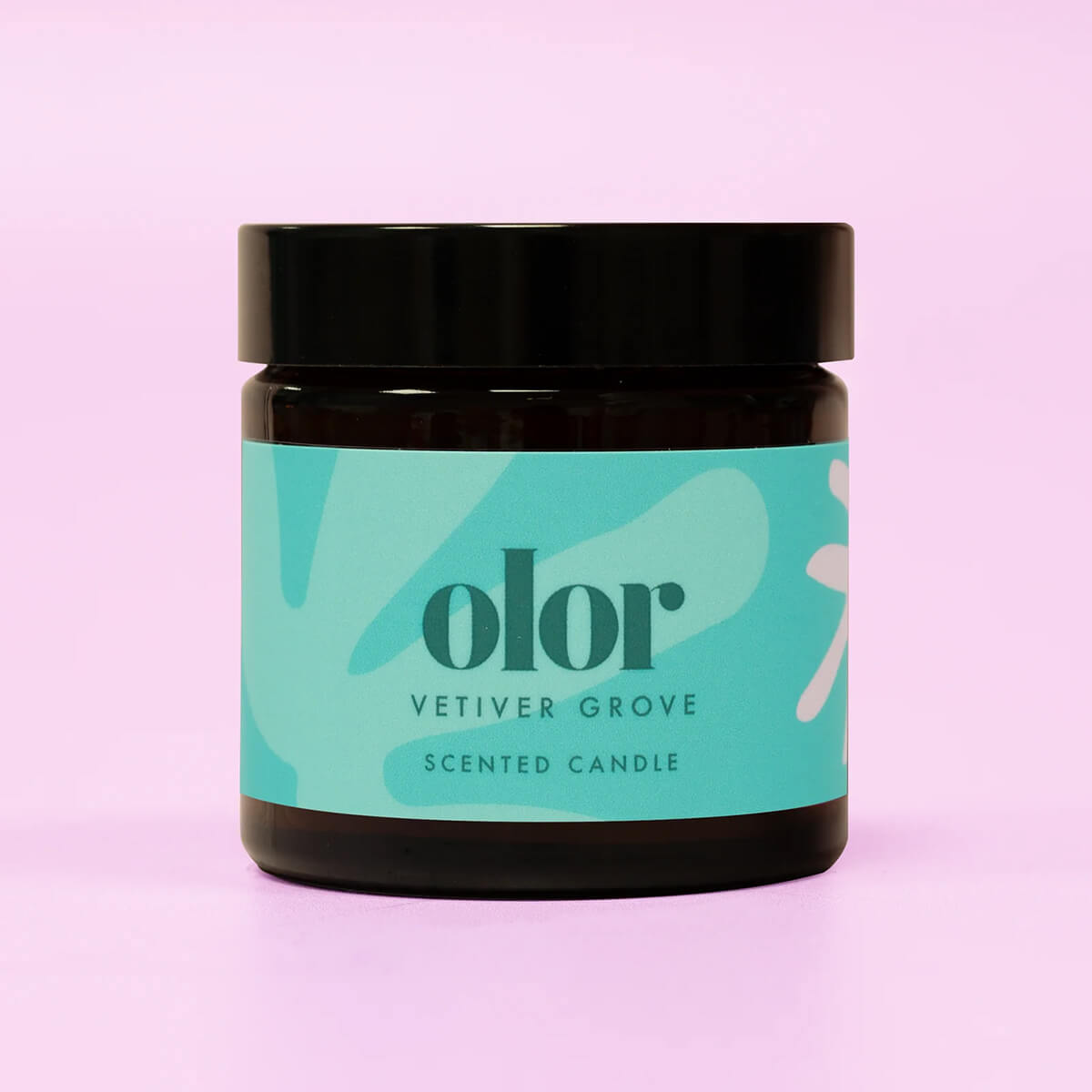 Vetiver Grove Mini Jar Candle by Olor. Experience a dark and sophisticated fragrance, with top notes of basil, cypress and chamomile. Infused with the freshness of bergamot, grapefruit and lemons, resting on an intense wood accord of patchouli, vetiver and cedarwood. Small in size, but big on fragrance, the Olor mini jar candle delivers a luxurious scent experience in a beautifully compact form. Designed for those who adore little luxuries, this elegant mini is perfect for smaller spaces, travelling, or for those who love to layer and blend fragrances throughout their home. Though petite, each mini jar is thoughtfully crafted with the same attention to detail and high-quality ingredients as Olor's larger candles, effortlessly filling your space with beautiful, long-lasting fragrance. Whether you’re trying a new scent, curating a personal mix of aromas, or gifting a touch of luxury, the Olor mini jar candle brings sophistication and scent to every moment.
