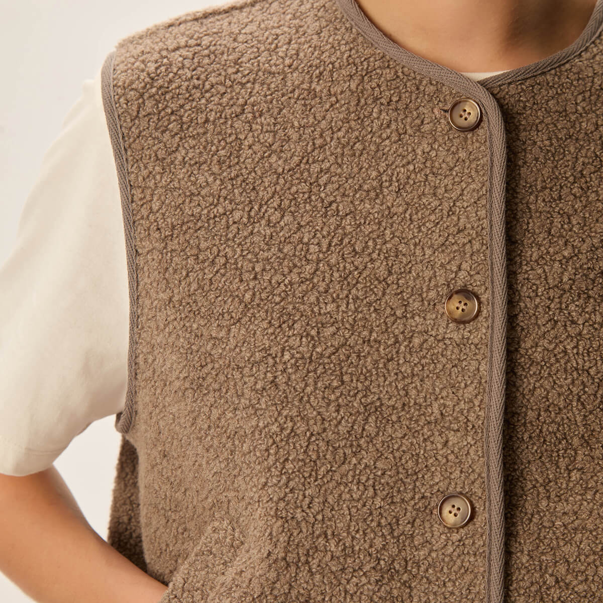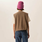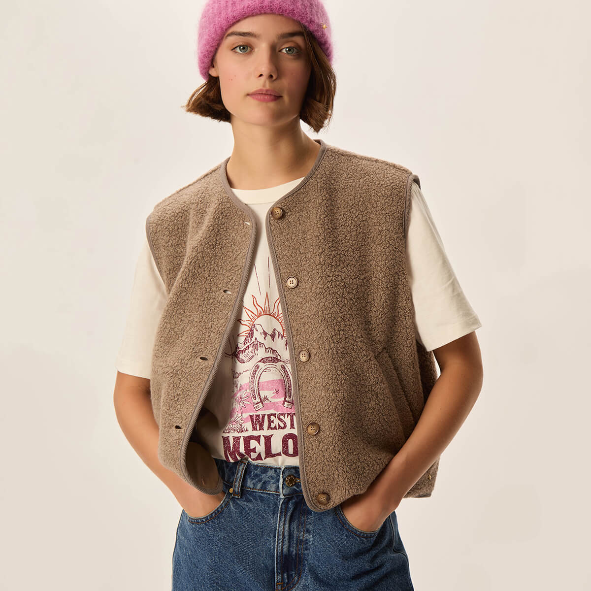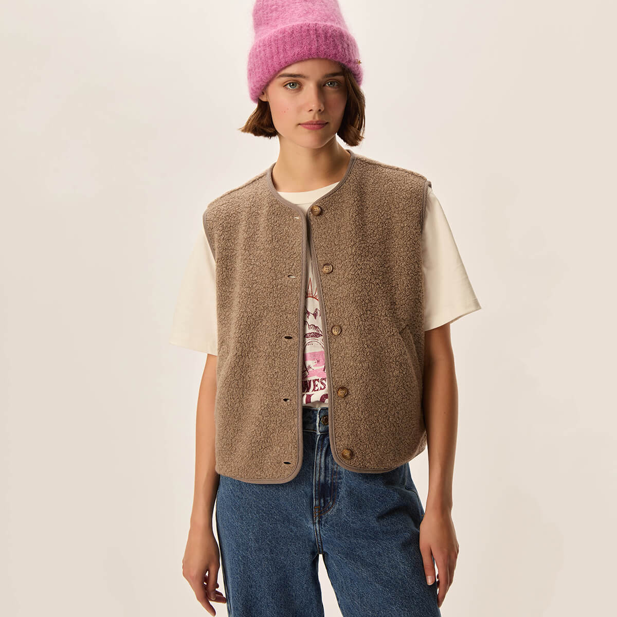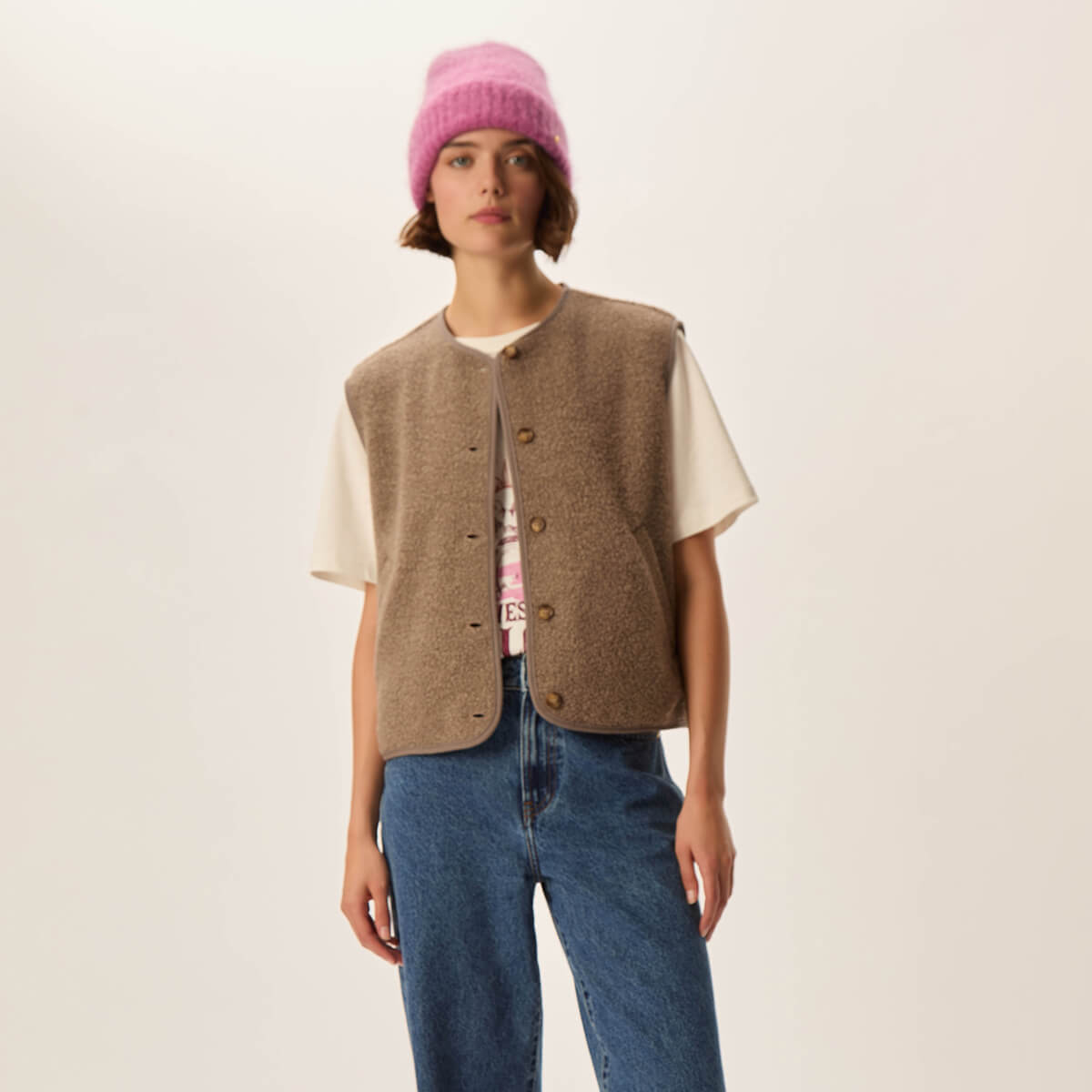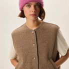 Zlata Vest by Des Petits Hauts.A feminine cut with a bias and tone-on-tone buttoning, the Zlata sleeveless jacket in bouclé wool has become a must-have. Minimalist and easy to pair with a blouse or a sailor top, you will immediately adopt its bouclé look.