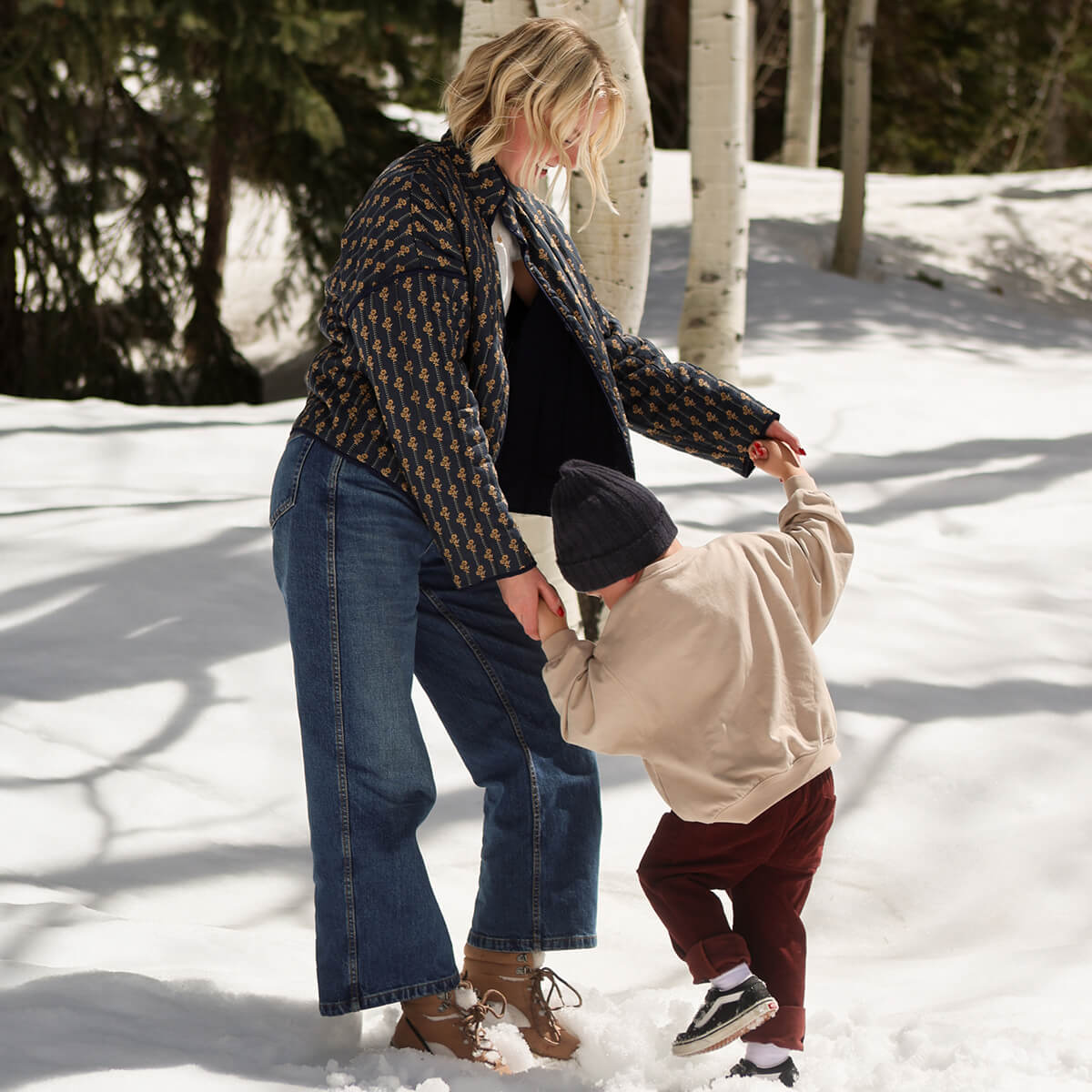 Adult Quilted Jacket by Rylee & Cru. This stylish quilted jacket features a wide, relaxed fit with drop shoulders, contrast binding, and front patch pockets. Finished with classic hook-and-eye closures down the front for a touch of vintage charm.