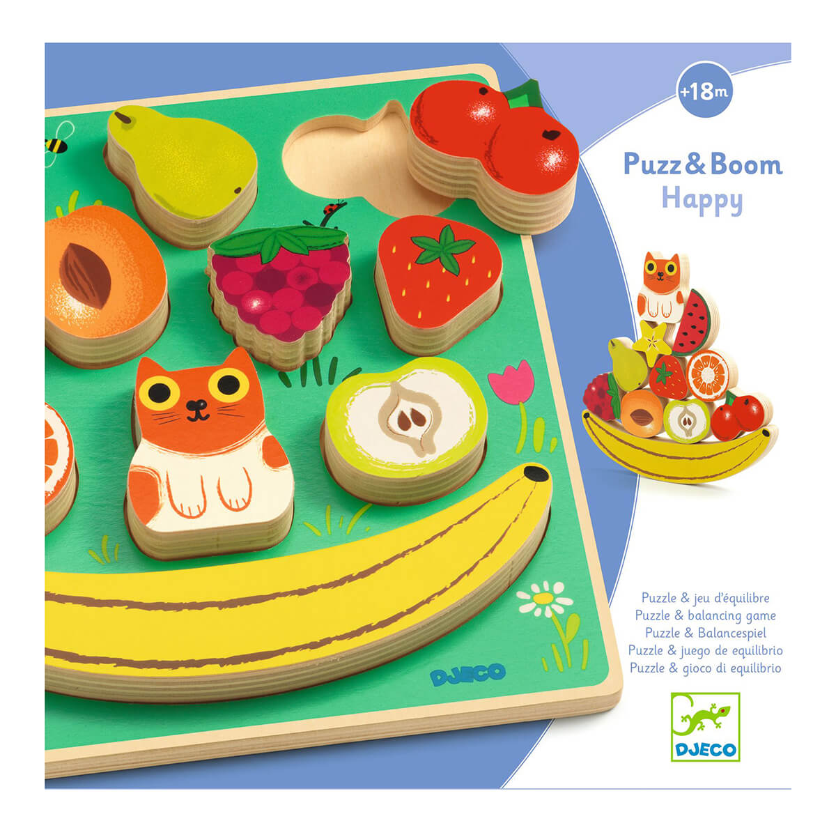 Puzz & Boom Happy Wooden Puzzle And Balancing Game by Djeco. Puzz & Boom is an easy-to-assemble wooden puzzle and balancing game. The 3D fruit and cat stand up by themselves and can be balanced on top of each other to form a pyramid on the banana base.