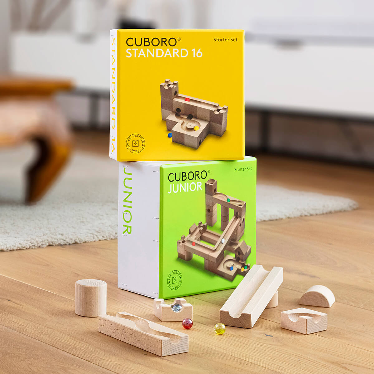 The Cuboro marble run system from Switzerland has been inspiring generations worldwide since 1986. Made from high quality and sustainable Swiss beech wood, the marble run system consists of over 100 different Cuboro elements with various functions. Through creative combinations and logical planning, you can create an infinite number of marble runs.