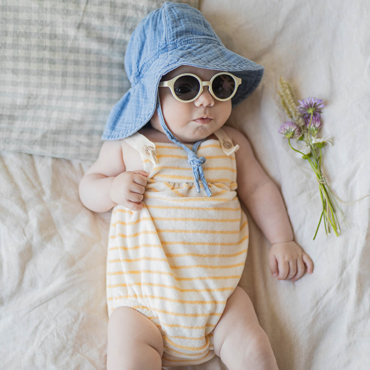 Daniele Hat by 1+ in the Family. Sun hat with chin straps in a super soft washed muslin fabric.