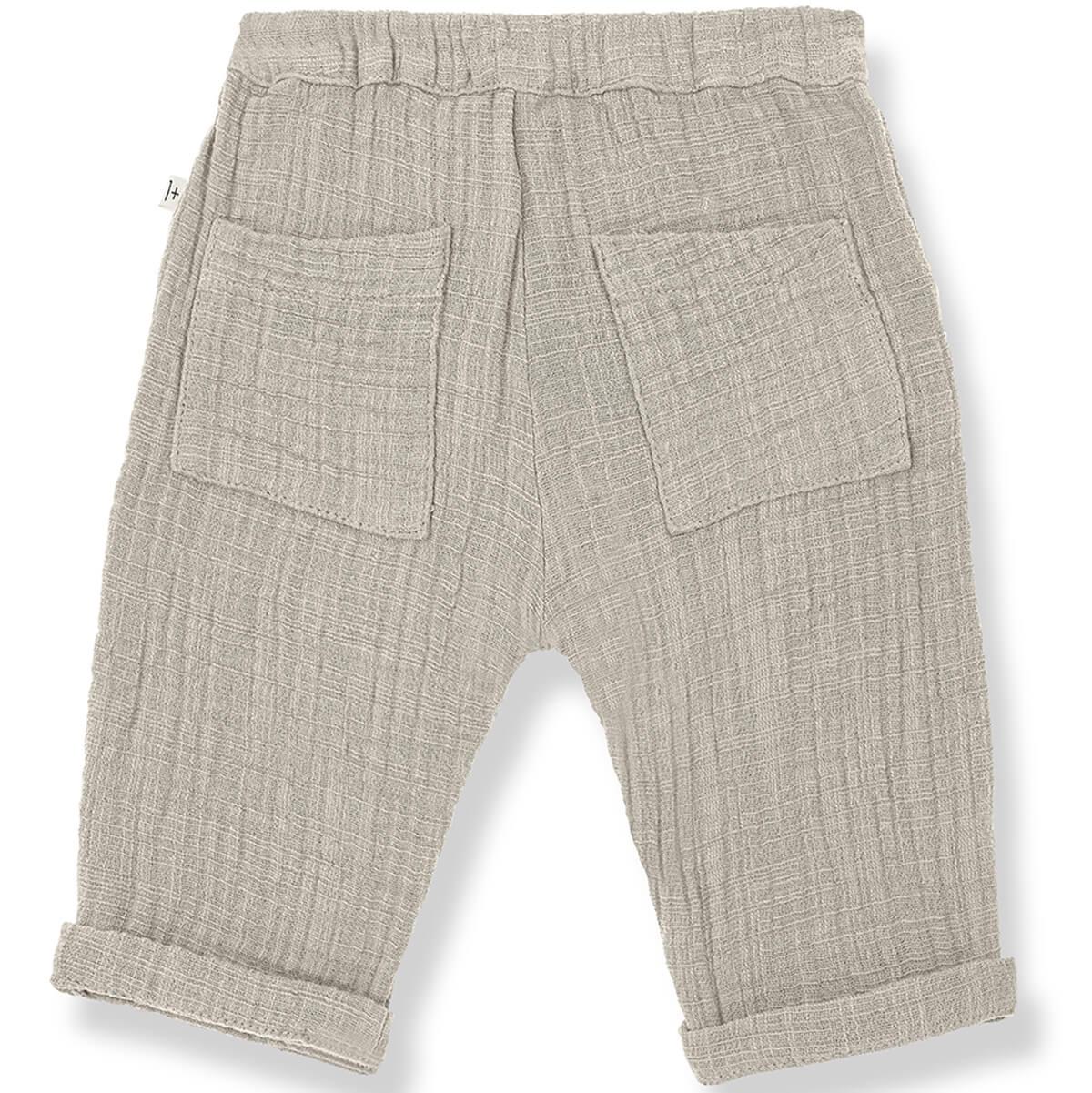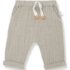 Giorgio Pants by 1+ in the Family. Sweet baby pants in a rustic double face fabric. With elasticated drawstring waist, back pockets and roll up ankle cuffs.