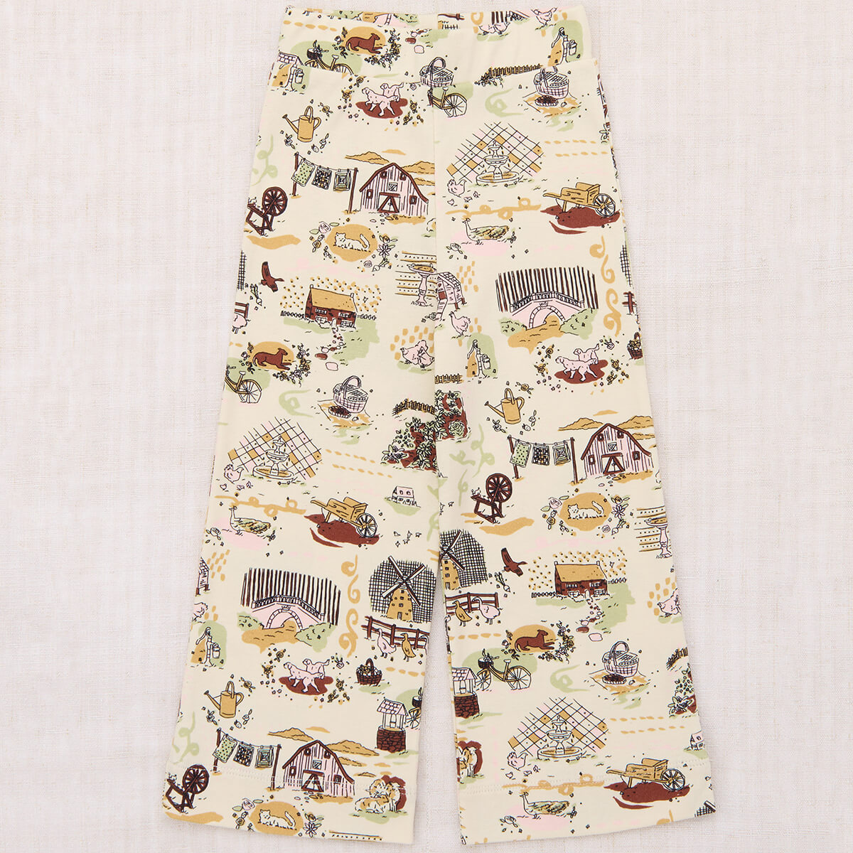 A-Pant by Misha & Puff. A fitted pull-on pant in organic Pima cotton, featuring a slight A-shaped flare and a soft banded elastic waistband. The print originates from a hand-painted design, with storybook scenes carefully translated into fabric.