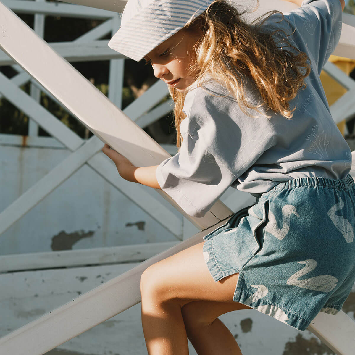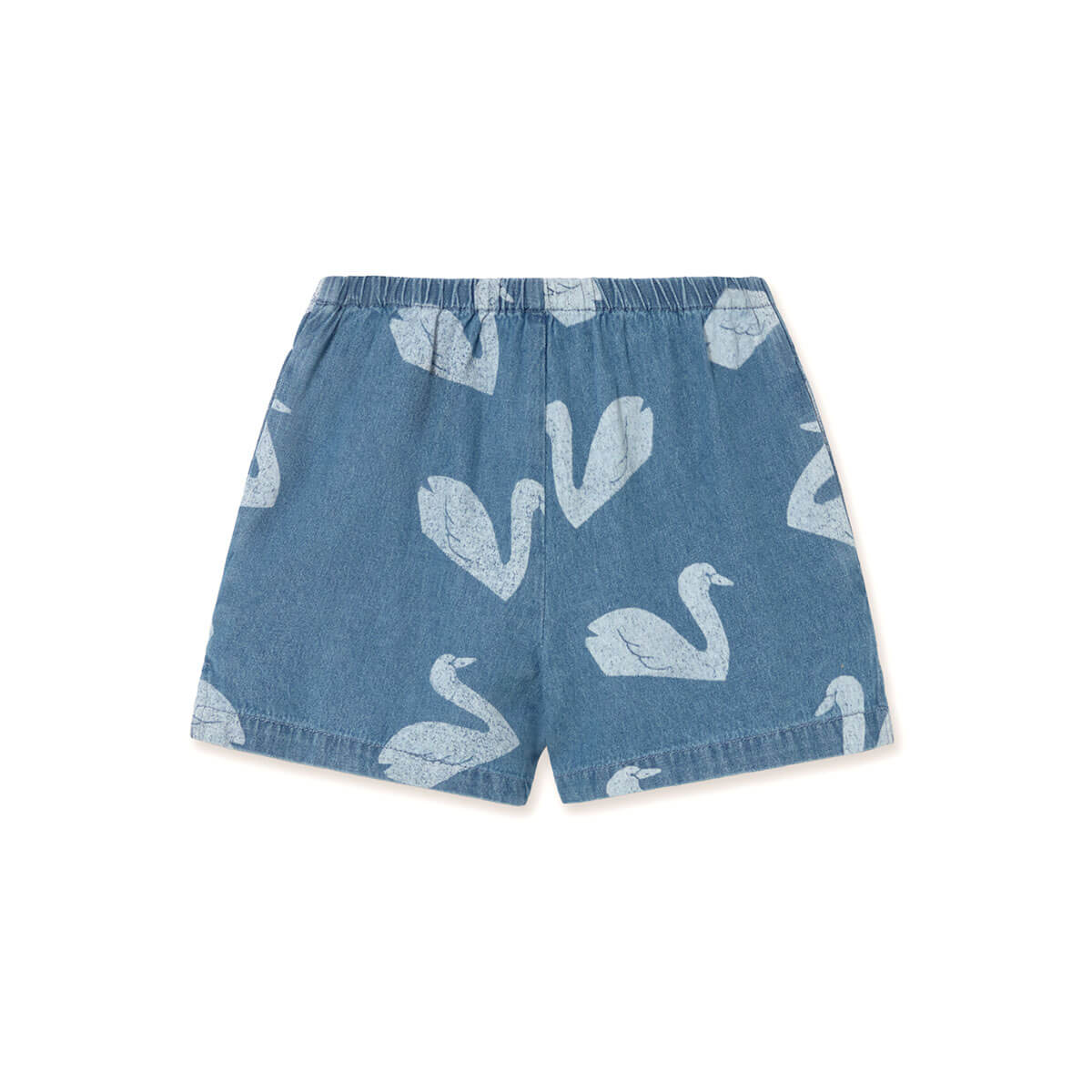 Big Swans Shorts by Tinycottons. These denim shorts combine comfort and style in a playful, practical design. Featuring a gathered elastic waistband, side pockets, and a fixed front bow, they provide a comfortable fit and a charming touch to complete any summer outfit.