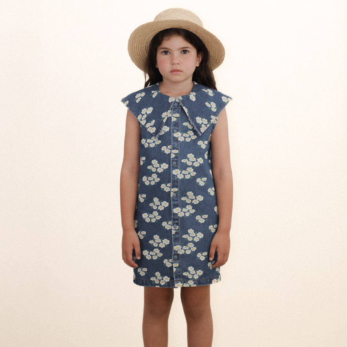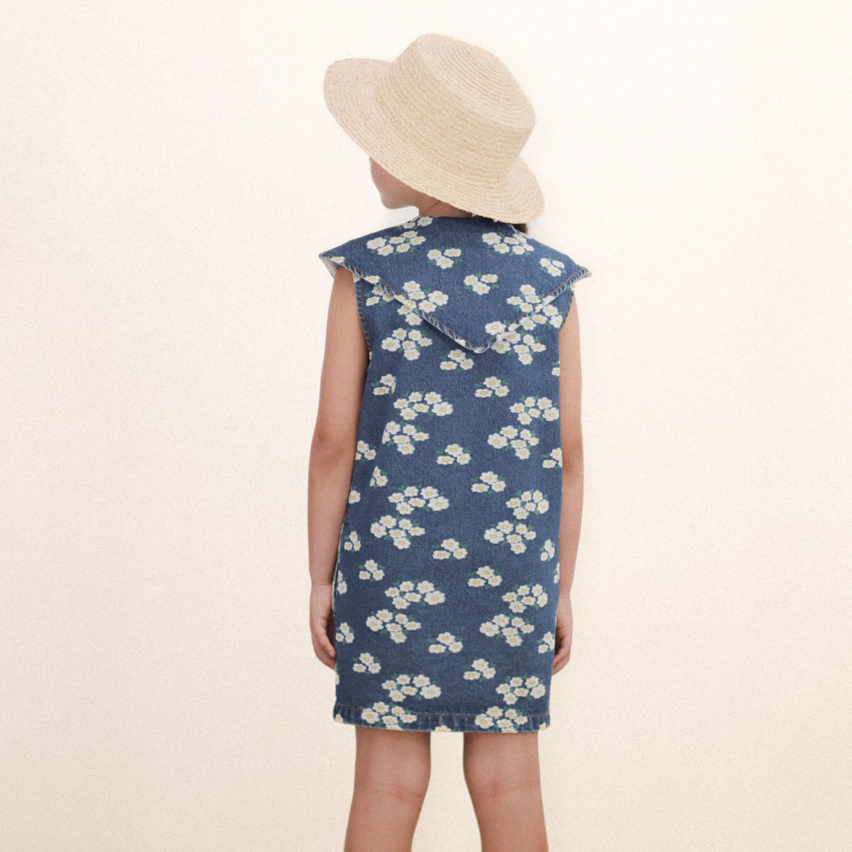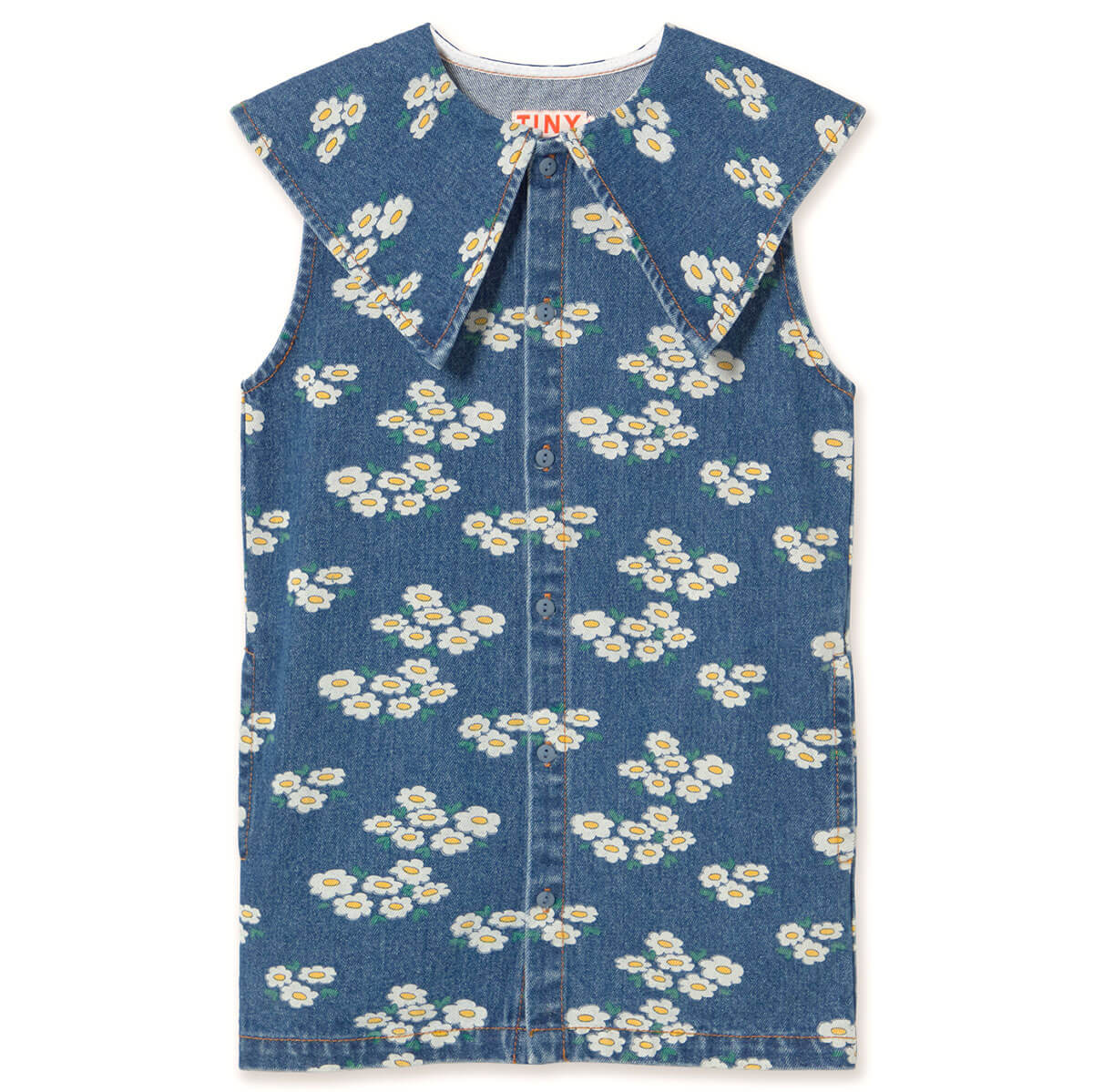 Blossoms Dress by Tinycottons. This sleeveless short denim dress blends style and comfort in a light, detail-rich design. Featuring a blossoms print and front patch pockets, it has a sailor style collar at both front and back, with a full length button closure for easy wear. Perfect for casual outfits with a fresh and delicate touch.