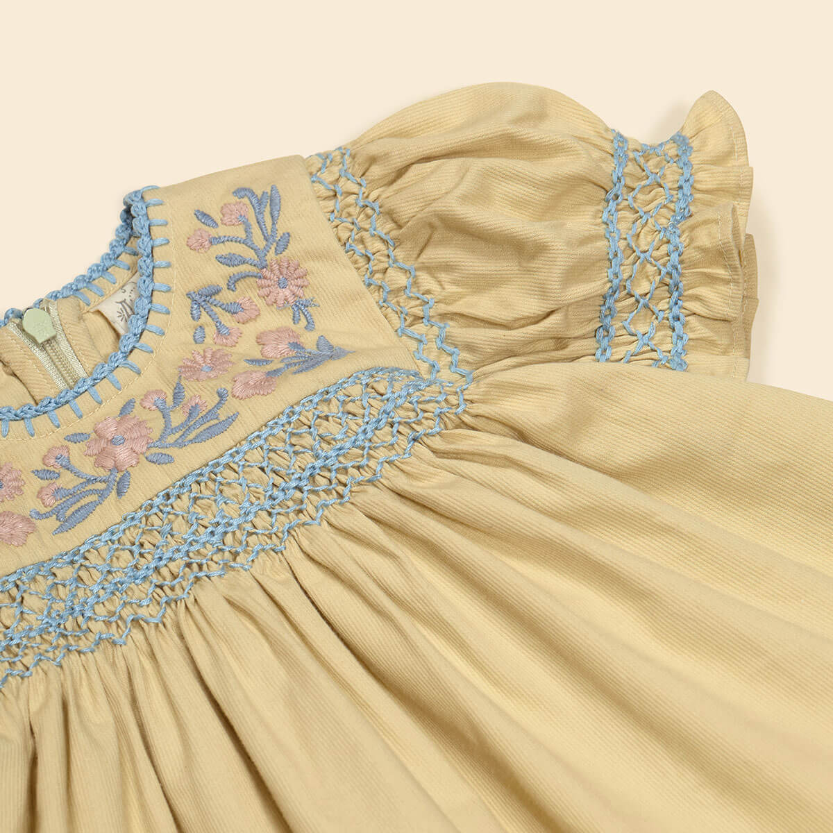 Dora Baby Blouse by Apolina. The pretty Dora blouse comes in soft green ‘cloud’ self stripe cotton, with sweet vintage shaping, contrast blue hand smocking at chest and sleeves, hand crochet finish at neckline, and blanket stitch at hem. Floral embroideries in the season’s pastel tones decorate the chest. Invisible zip at back.