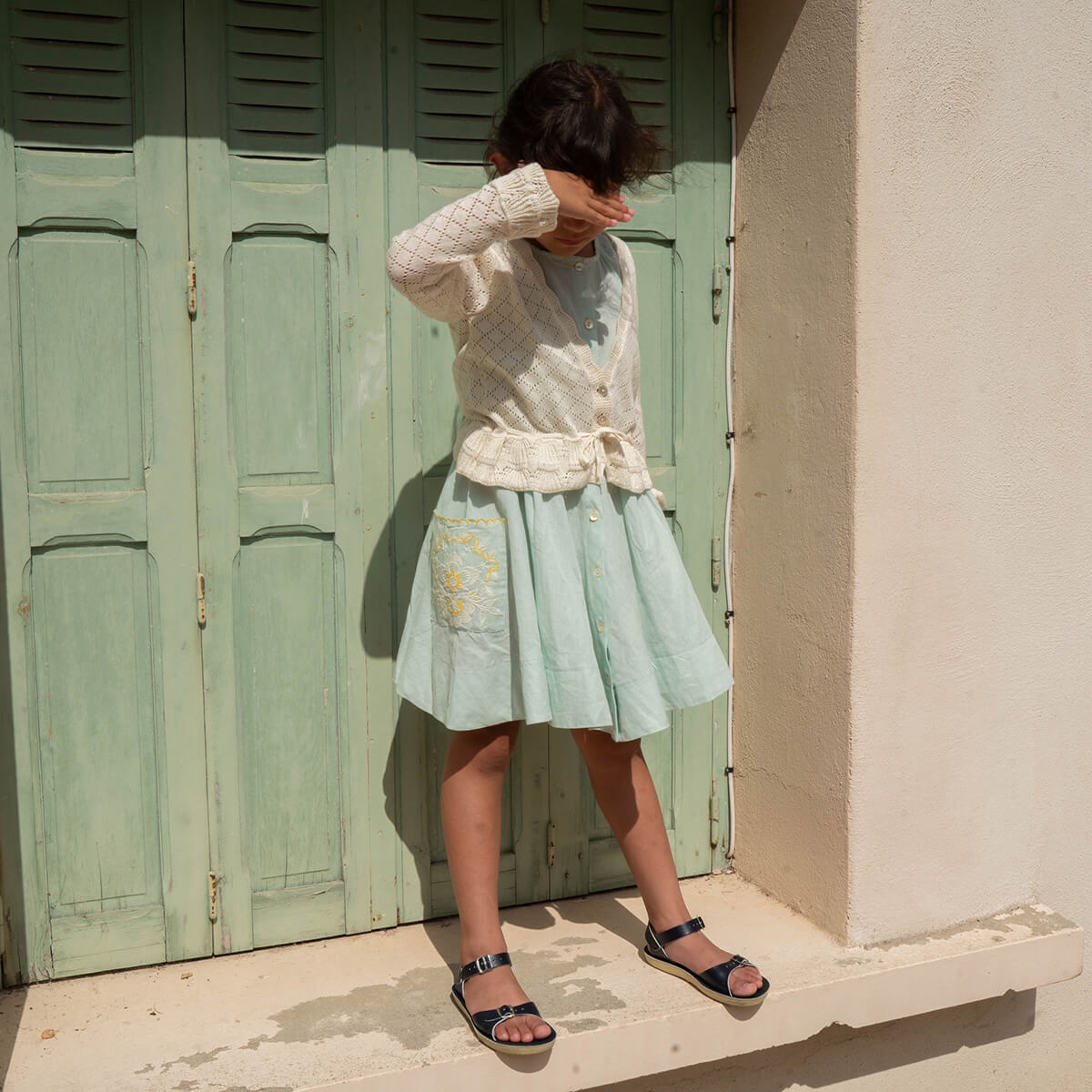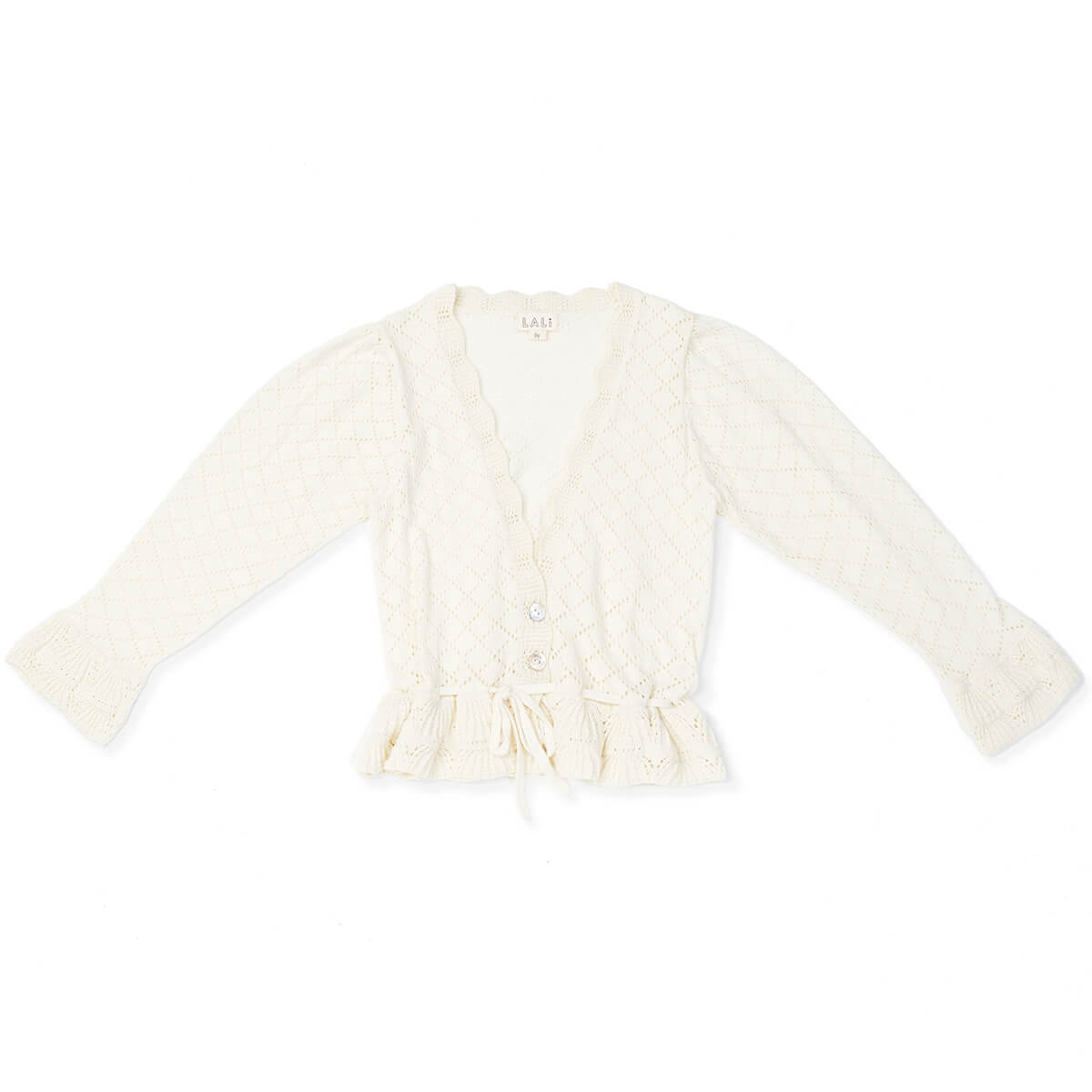 Knit cardigan by Lali. This beautiful, lacy knit 100% pima cotton sweater is sure to become a go-to for spring and summer. It features a deep V shaped neckline with a scalloped edge, and matching scalloped cuffs and hem.  Its pretty buttons and adjustable tie waist make it perfect to go over a summer dress, to extend their wear from crisp early spring days, into summer. Keep it handy to go over anything when warm summer days turn to cool summer evenings. Your child will love the bunny soft feel of this delightful light weight sweater.