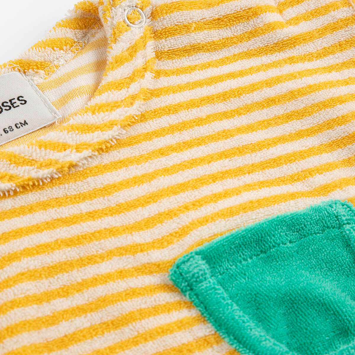 Yellow Stripes Terry Cloth Baby T-Shirt by Bobo Choses. Yellow tee designed with short sleeves, shoulder button fastening, embroidery, a round neck, patch pocket and a relaxed fit.
