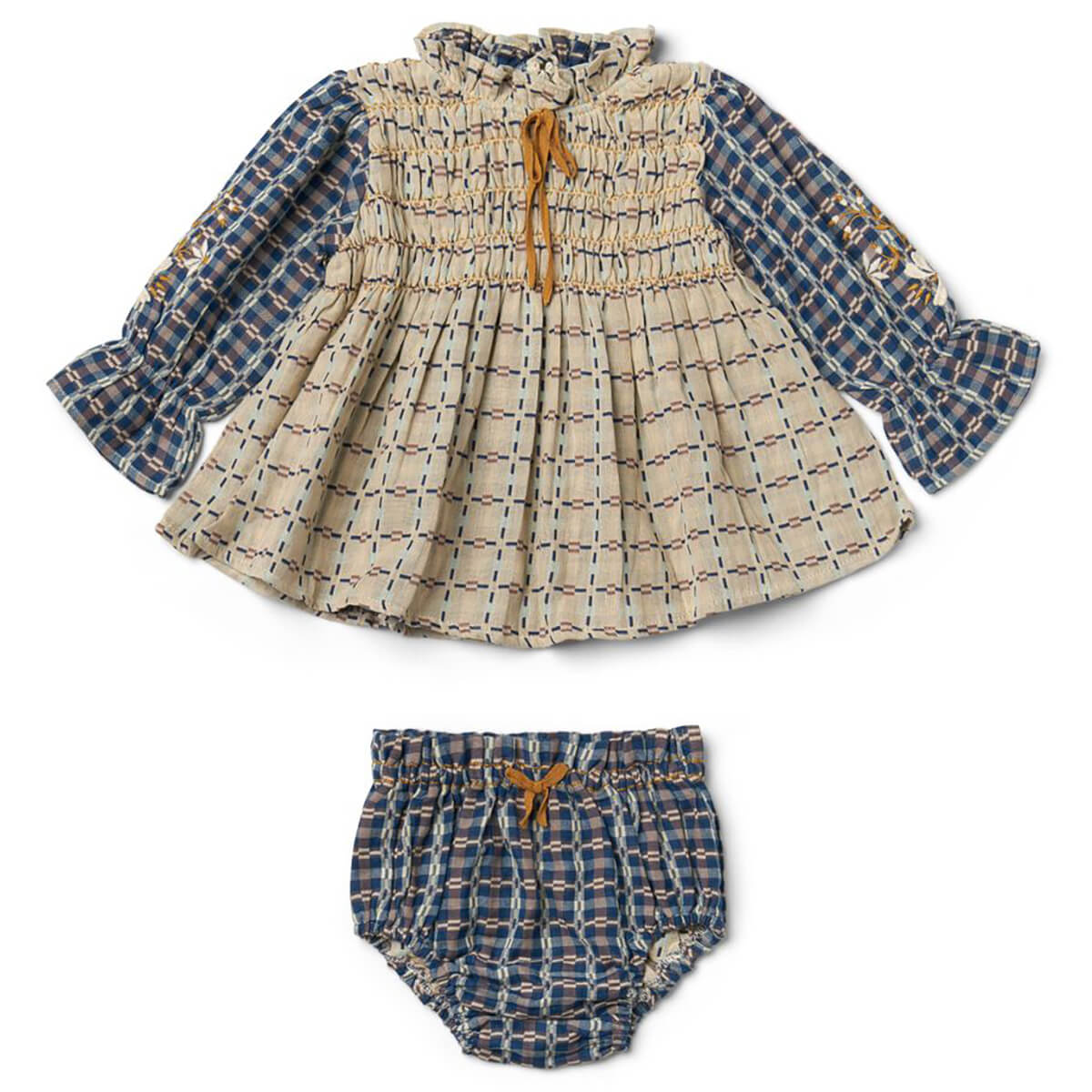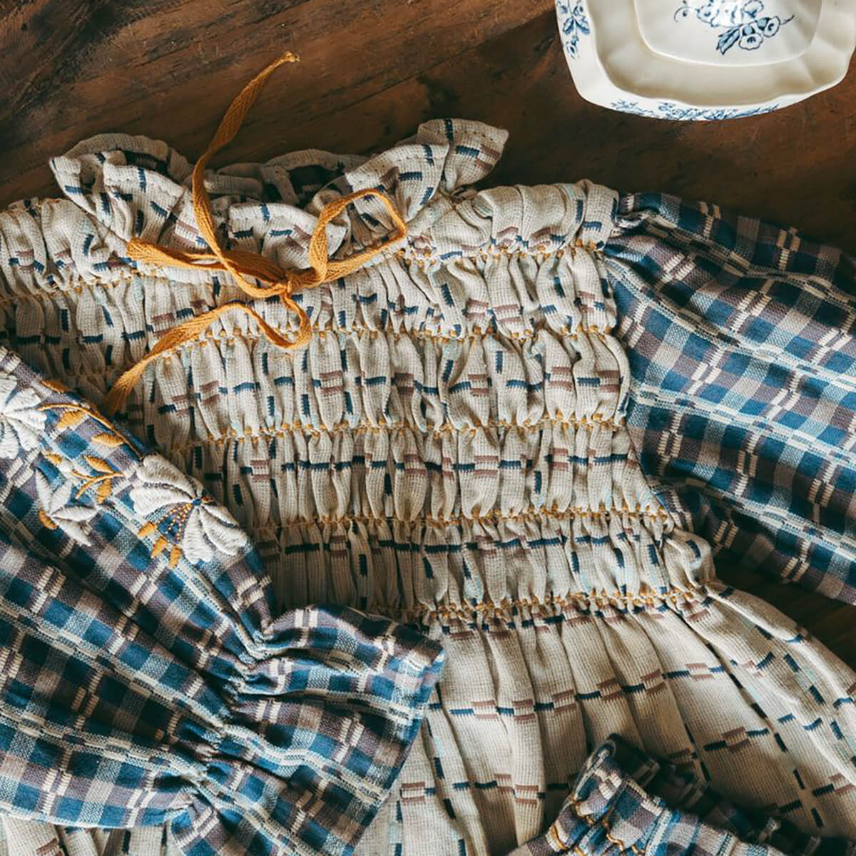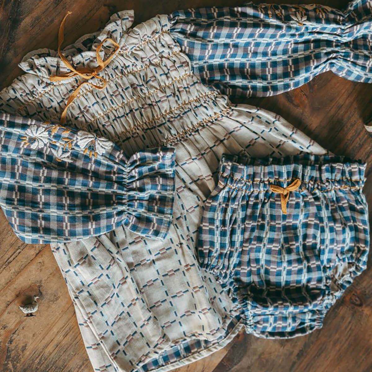 Little Parvati Set by Lali. The Little Parvati Set in Lali's custom double-sided fabric, inspired by vintage Indian woven blankets. The textured weight and warmth make it perfect for crisp fall days, while the clever use of both sides of the fabric creates playful color-blocking throughout. Finished with cheerful embroidery, this set is cozy, nostalgic, and full of whimsy—sure to become your little one’s favorite.