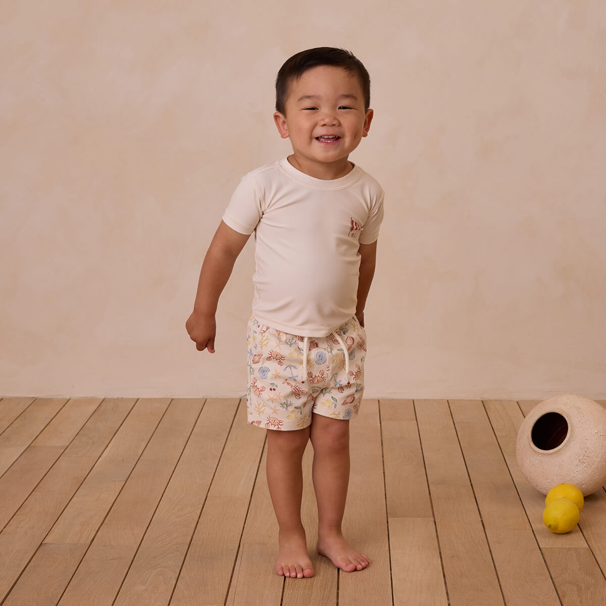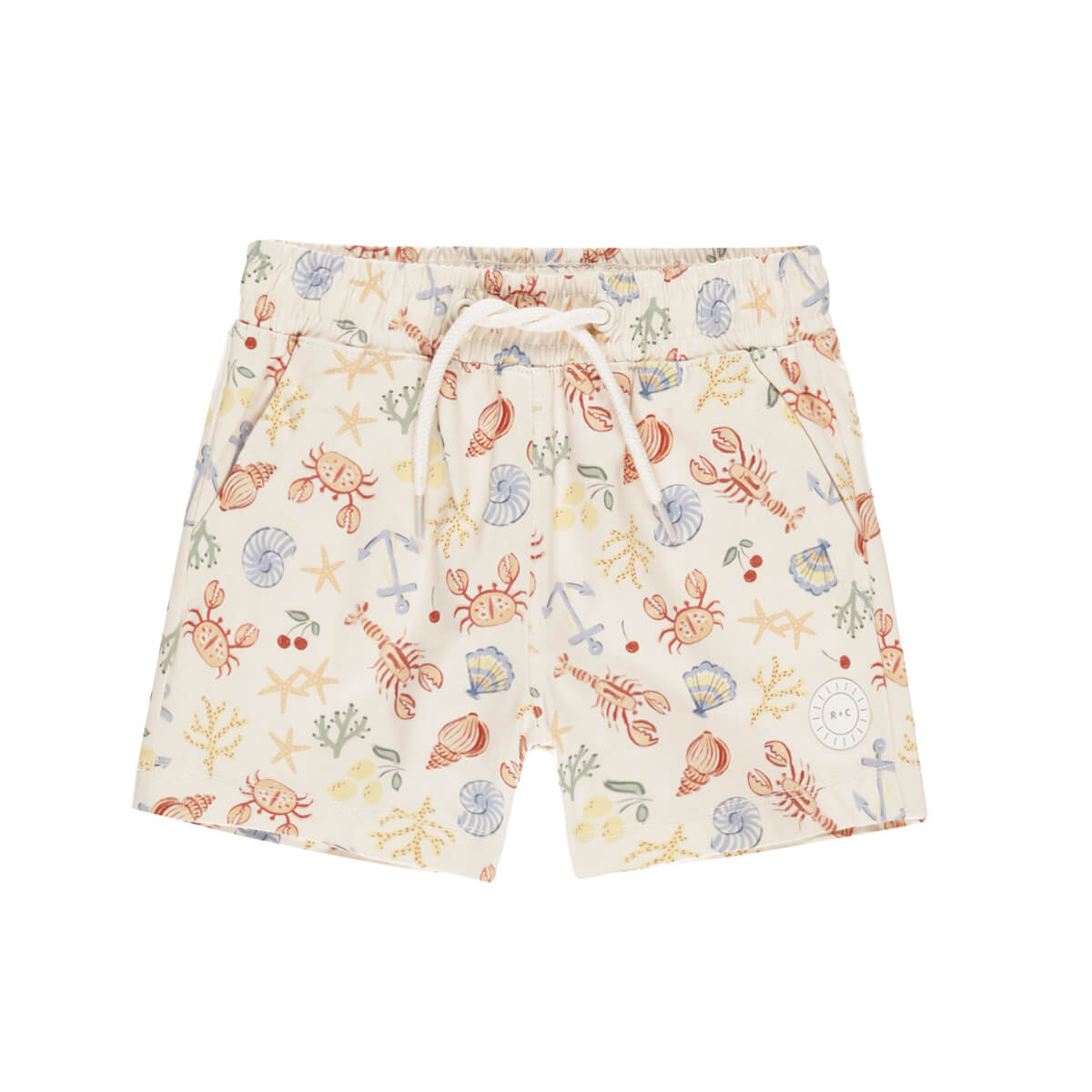 Boardshorts by Rylee & Cru. These soft boardshorts are perfect for pool and beach days! Featuring an elastic waistband with adjustable drawstring and pockets. Featuring a nautical print on natural hue. This beachy look will transport you to warm Mediterranean shores.