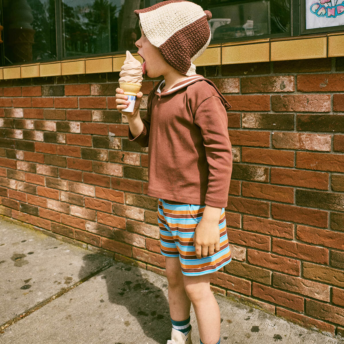 Cycling Short by Misha & Puff. A vintage-style pull-on short in organic Pima cotton, with an elastic waistband and curved pockets. Each stripe is yarn dyed separately before being knit together, creating rich color that lasts longer.
