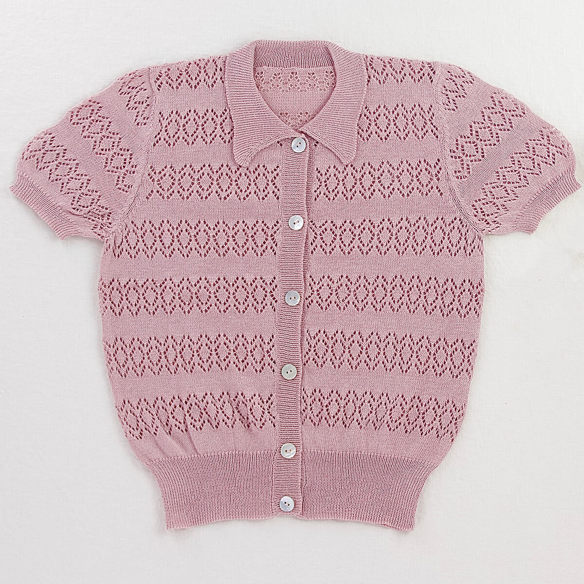 Openwork Lace Cardigan by Iver & Isla. A short sleeved knitted cardigan with pretty lace stitching and button up front.