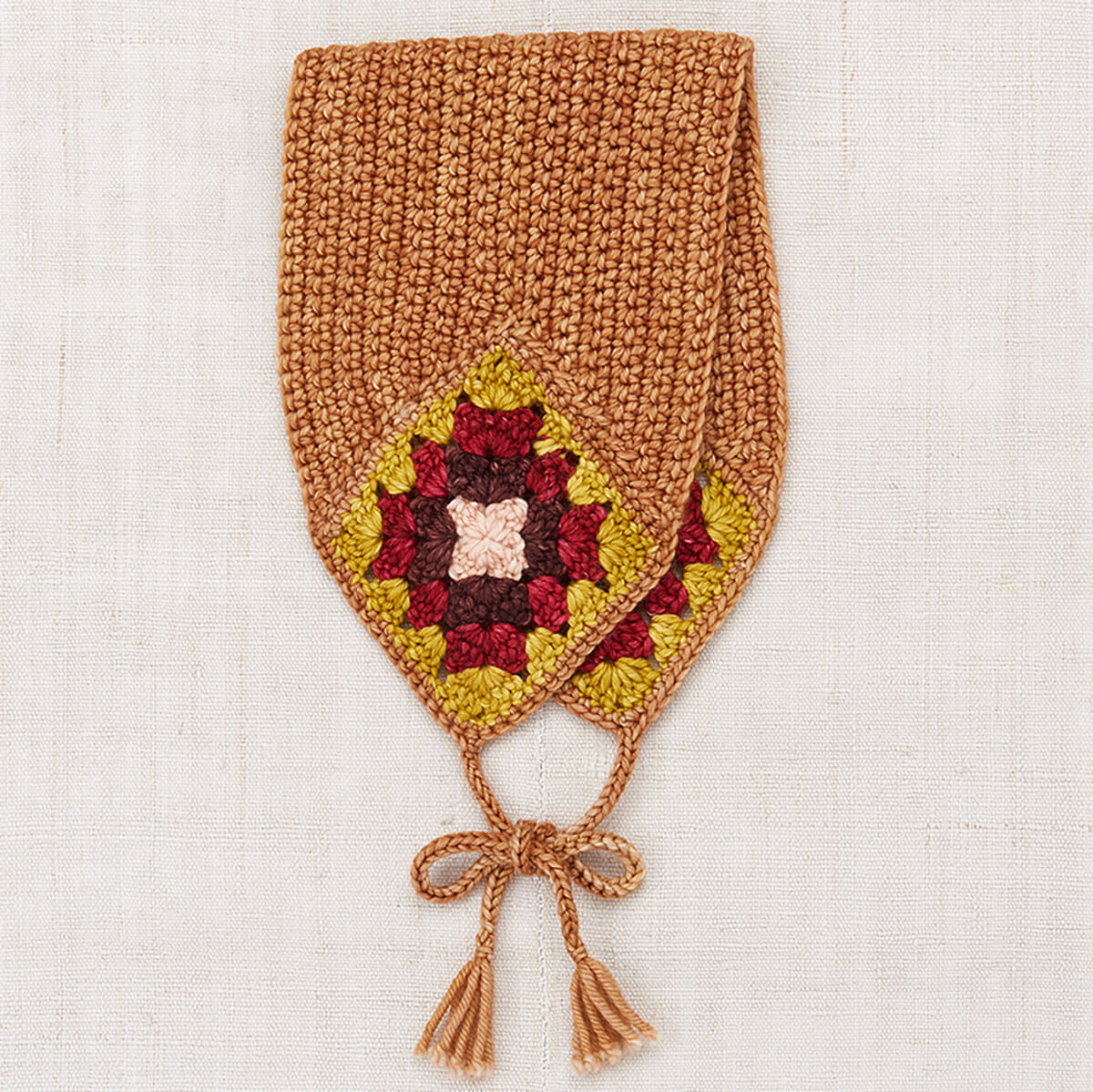 Crochet Headwarmer by Misha & Puff. A sweet hand-crocheted headwarmer in Merino wool. Featuring a "granny square" detail and tassel tie closure.