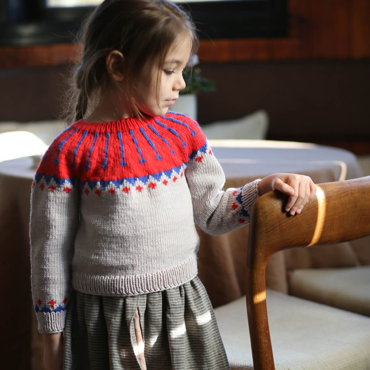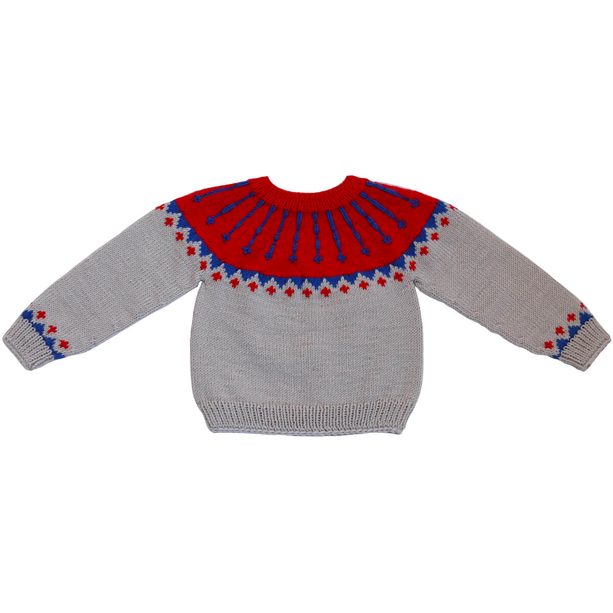 Aslan Sweater by Kalinka. Merino Wool jumper with a geometric pattern on the yoke and cuffs.