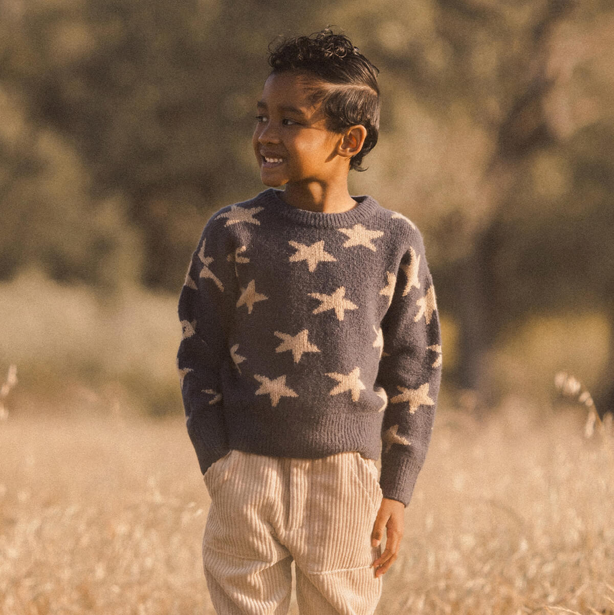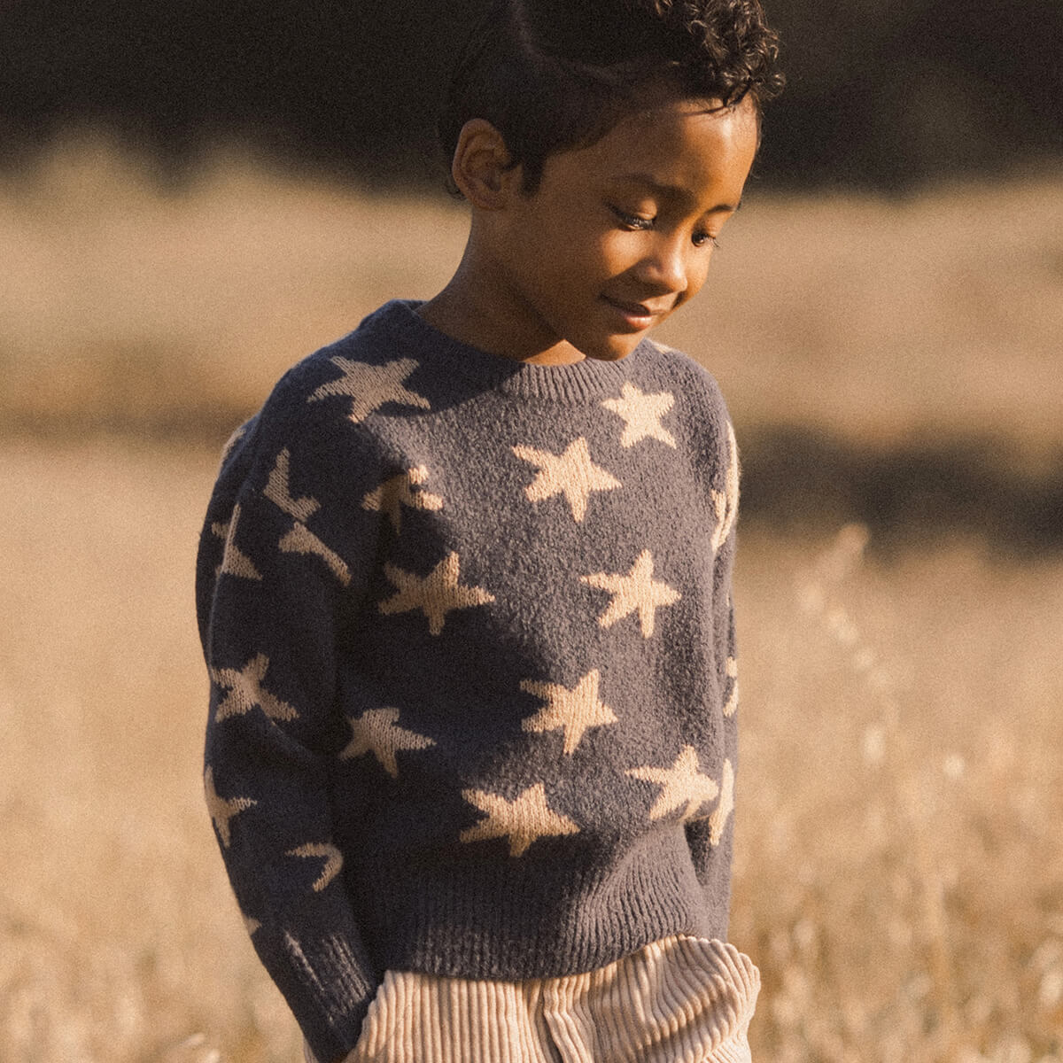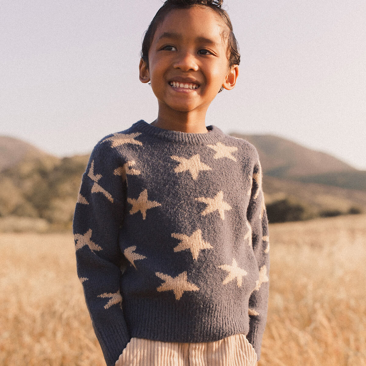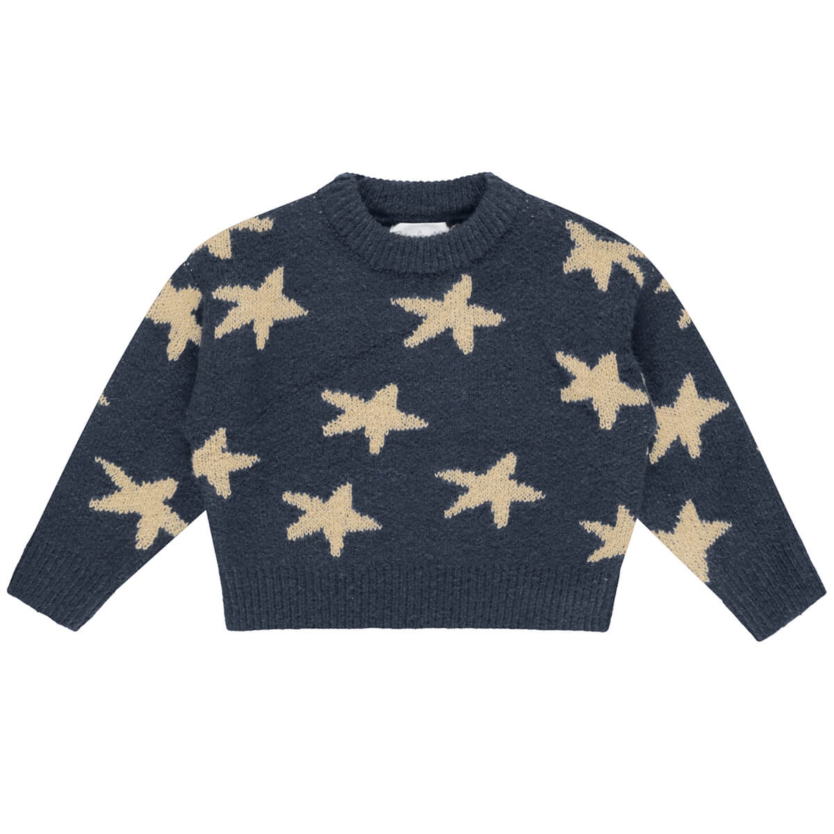 Aspen Sweater by Rylee & Cru. This super soft knitted jumper features a stars pattern as well as ribbing at neckline, sleeve openings, and bottom opening.