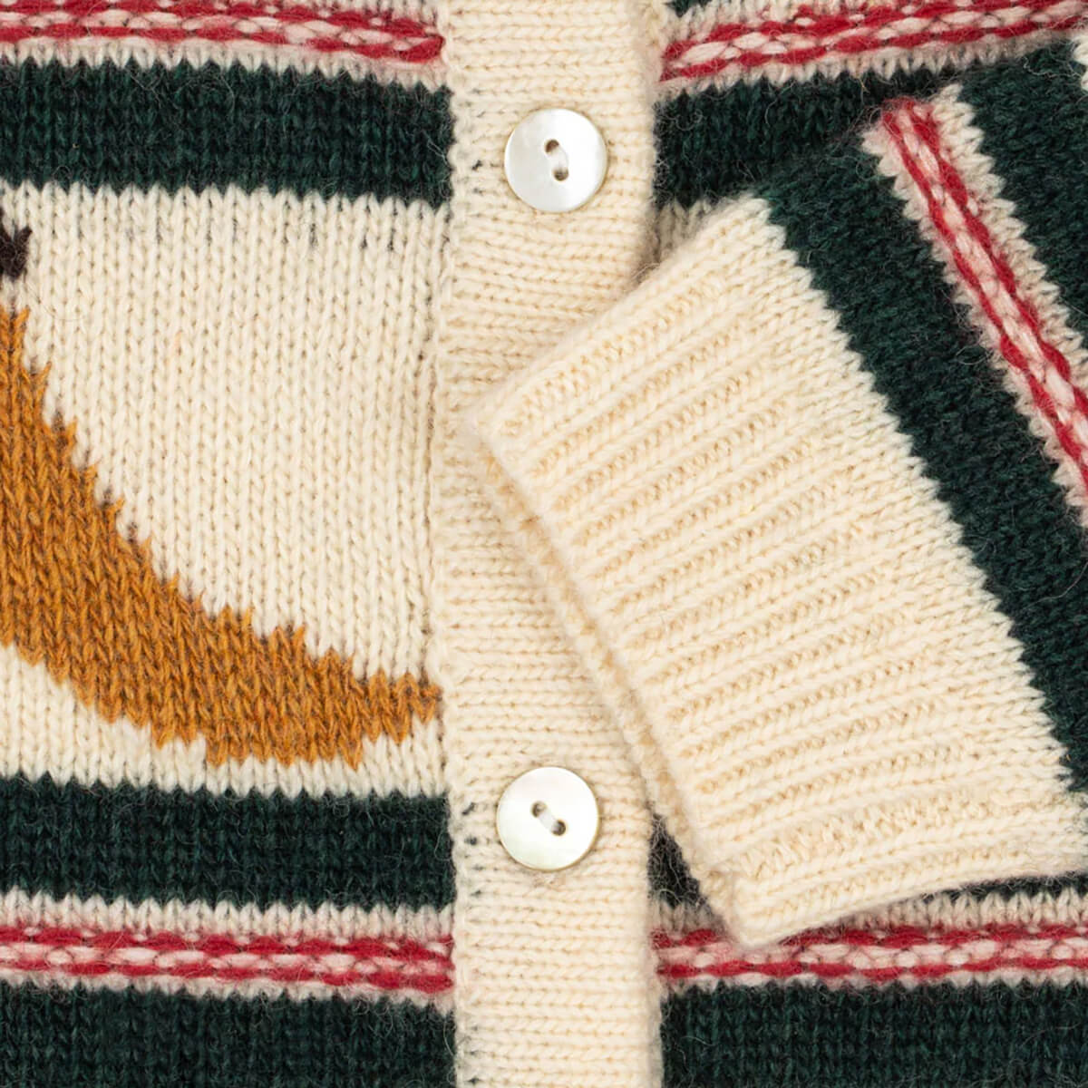 Billi Cardigan by Konges Sløjd. Warm knit cardigan in a fluffy wool blend. Classic design with a round neck, rib edges, and mother of pearl buttons in front.