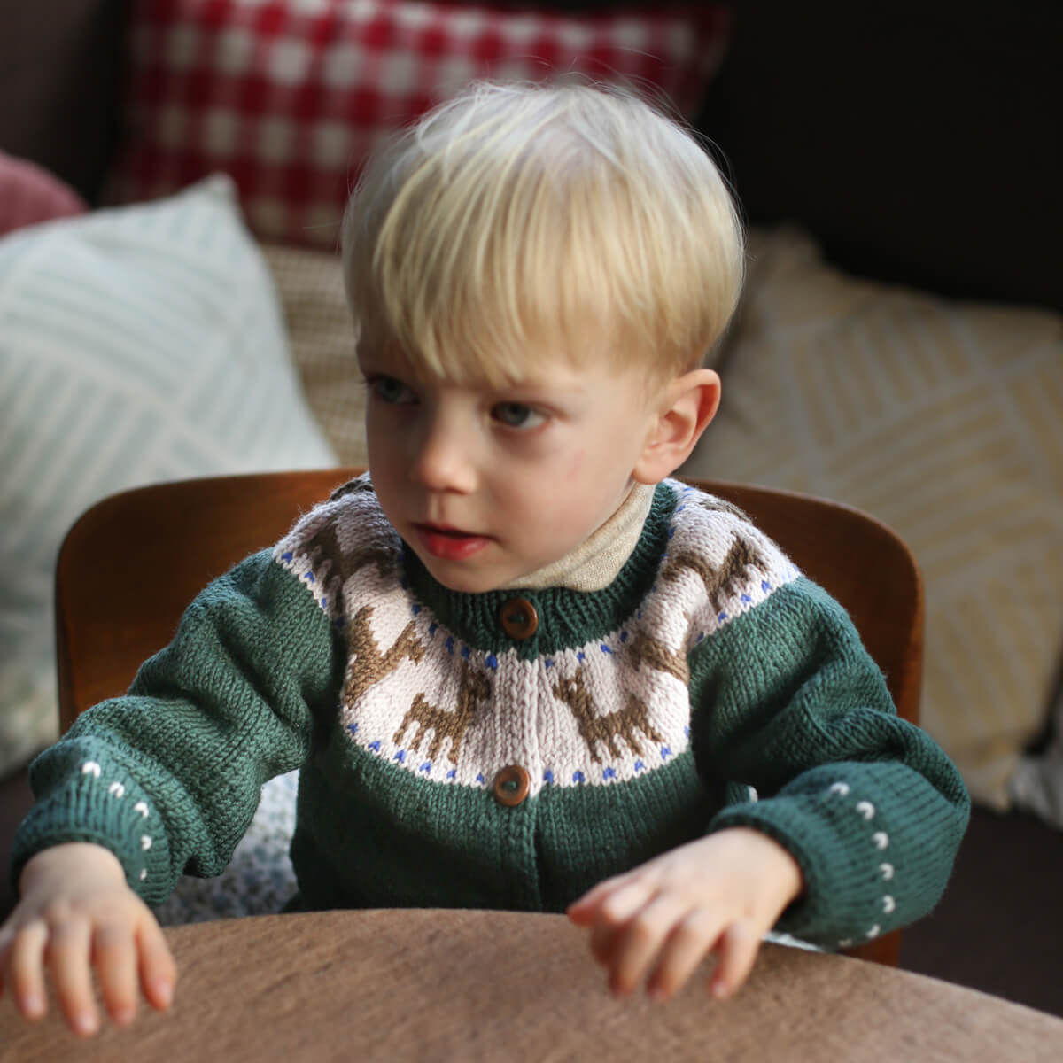 Lama cardigan by Kalinka. Merino Wool cardigan with a llama print across the yoke and wooden button closure.