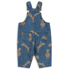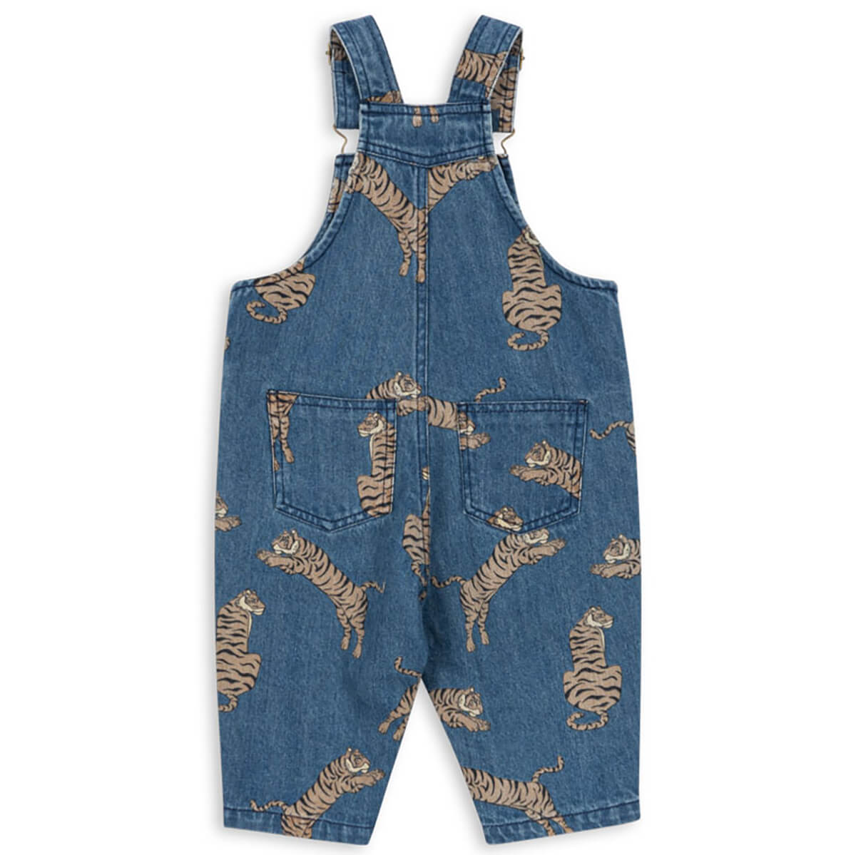 Magot Overalls by Konges Sløjd. Classic denim dungarees with a buckle closure and all over tiger print. Size 18 months has buttons on the inseam.