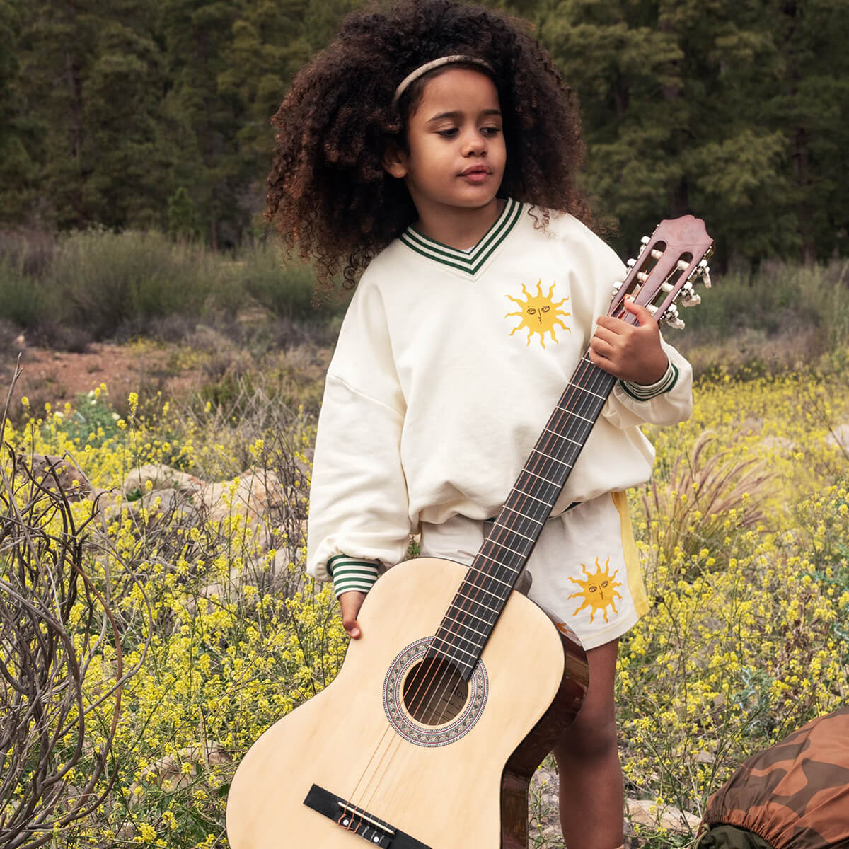 Sun Sweatshirt by Mini Rodini. Relaxed fit sweatshirt made from 100 % GOTS-Certified organic cotton. Designed with a ribbed V-neck and striped cuffs.
