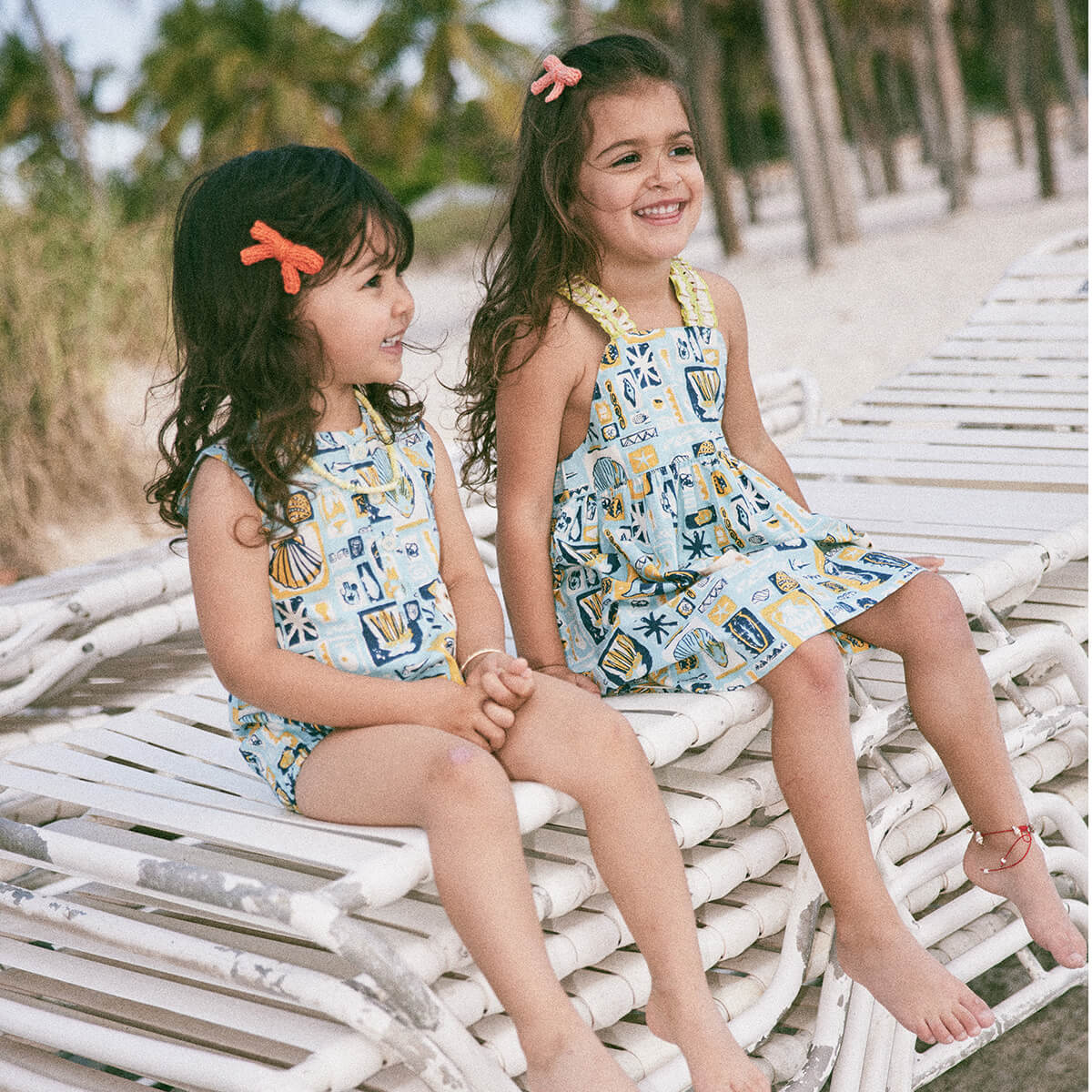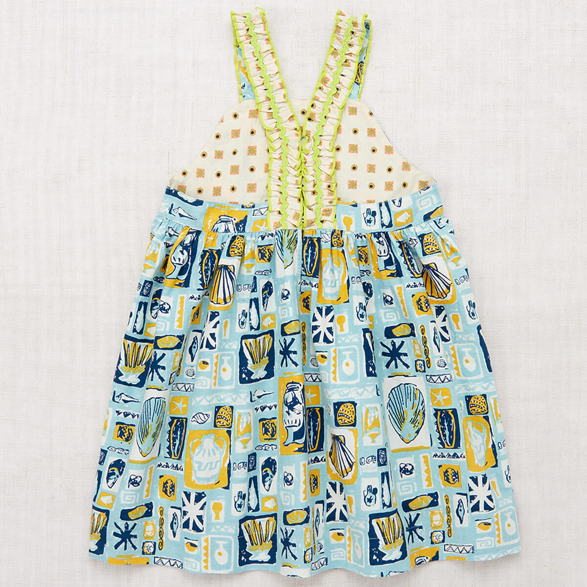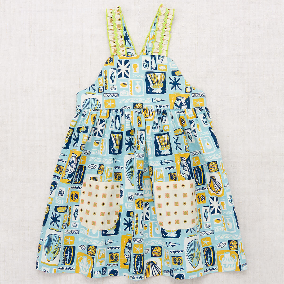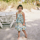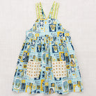 Willa Dress in Sky Collection by Misha & Puff. A new dress in cotton poplin, with a high waist and gathered bib, contrast print ruffle straps with rickrack appliqué trim, two contrast print patch pockets in the front, contrast print interior lining on the top, and corozo button closure on back of the straps. Finished with French seams. Featuring a hand-crafted graphic print inspired by mid-century vacation prints.