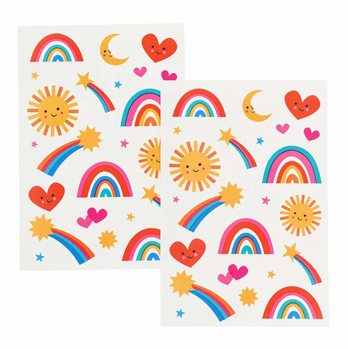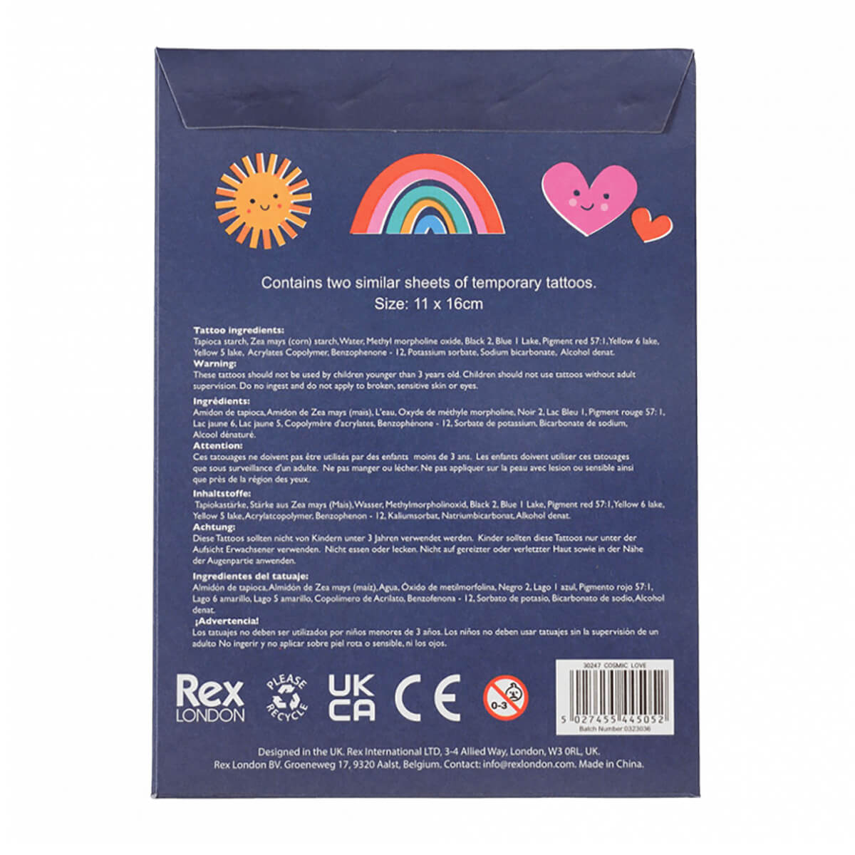 Temporary Tattoos by Rex London. These fun Cosmic Love temporary tattoos are a festival must-have! Featuring rainbows, hearts, suns and more, they are also a perfect filler for stockings and party bags. A temporary tattoo station is also loads of fun at children's parties. Easy to apply: just add water. Assorted sizes and images.