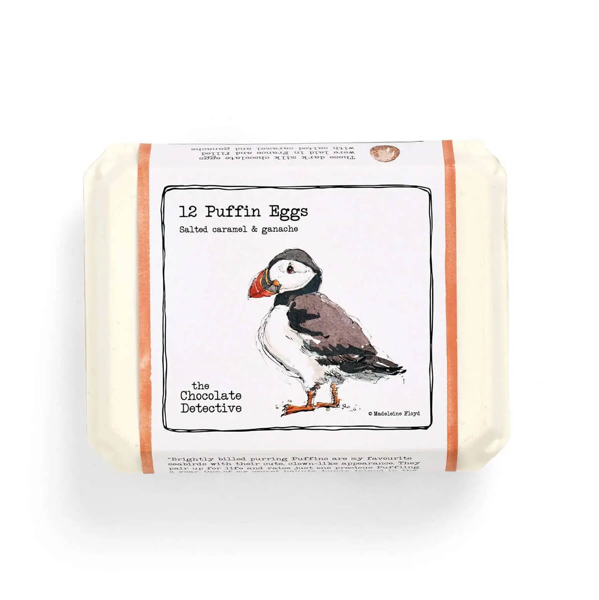 12 Puffin Eggs by The Chocolate Detective. 12 Chocolate Eggs filled with Salted Caramel. Layers of dark and milk chocolate are filled with a buttery ganache and gently salted caramel before being wrapped in a fine sugar shell and life-like speckles.